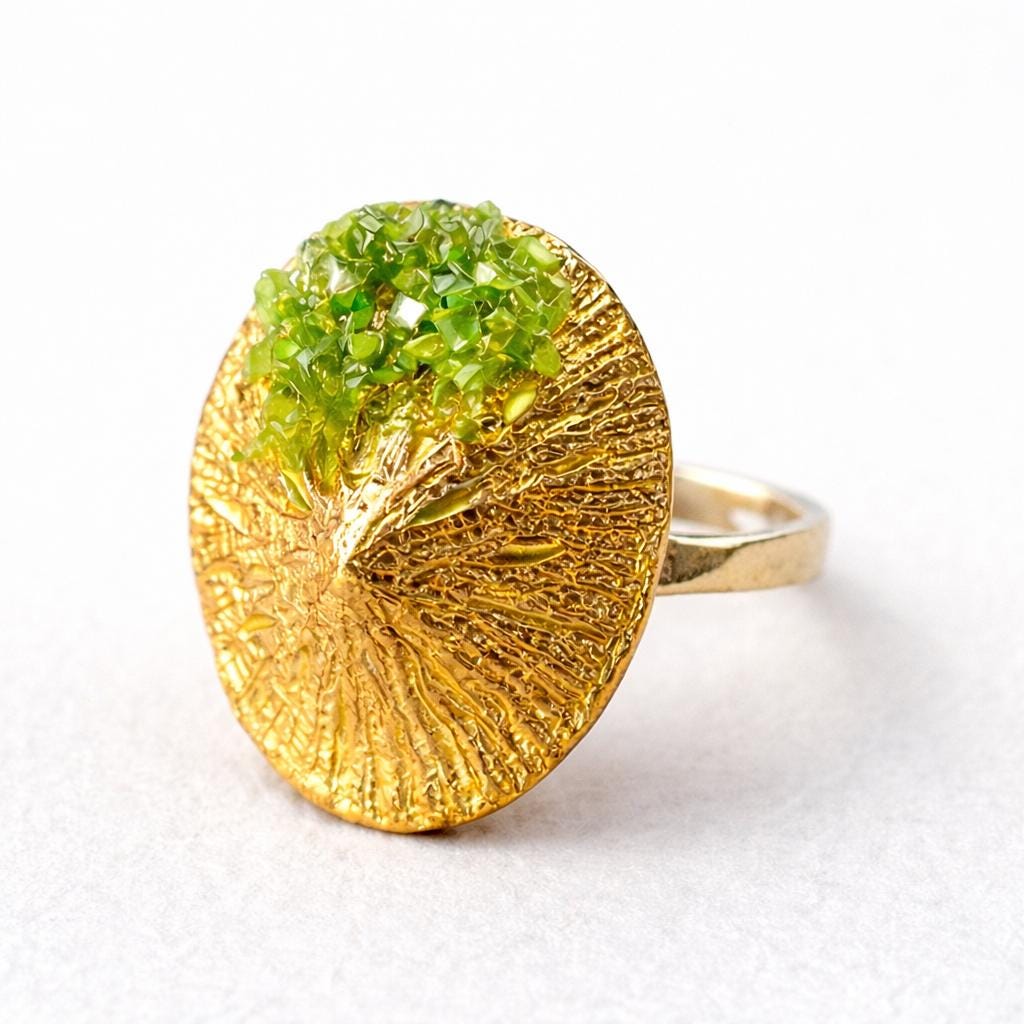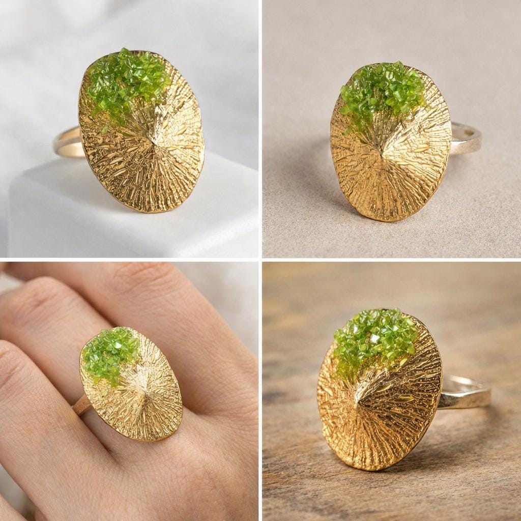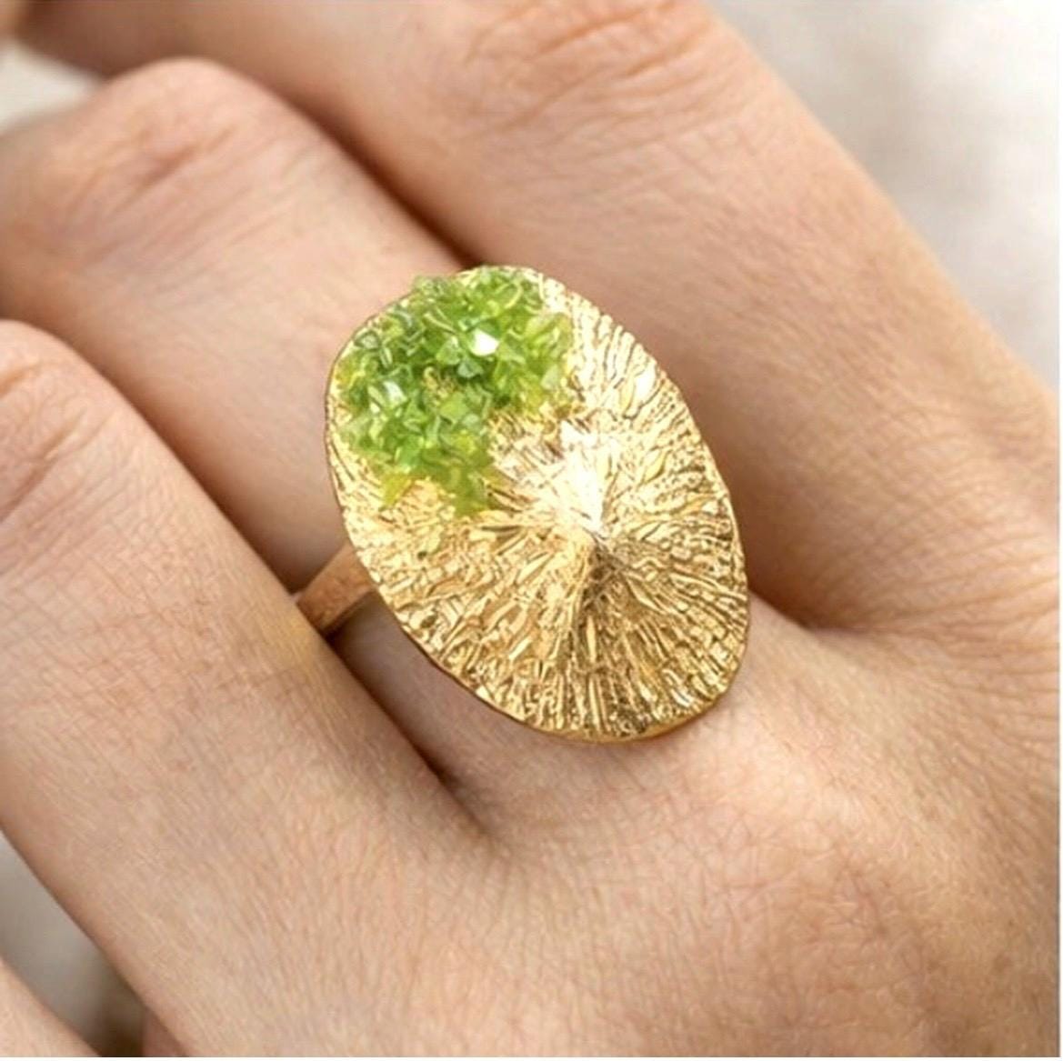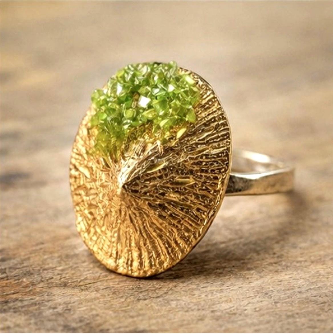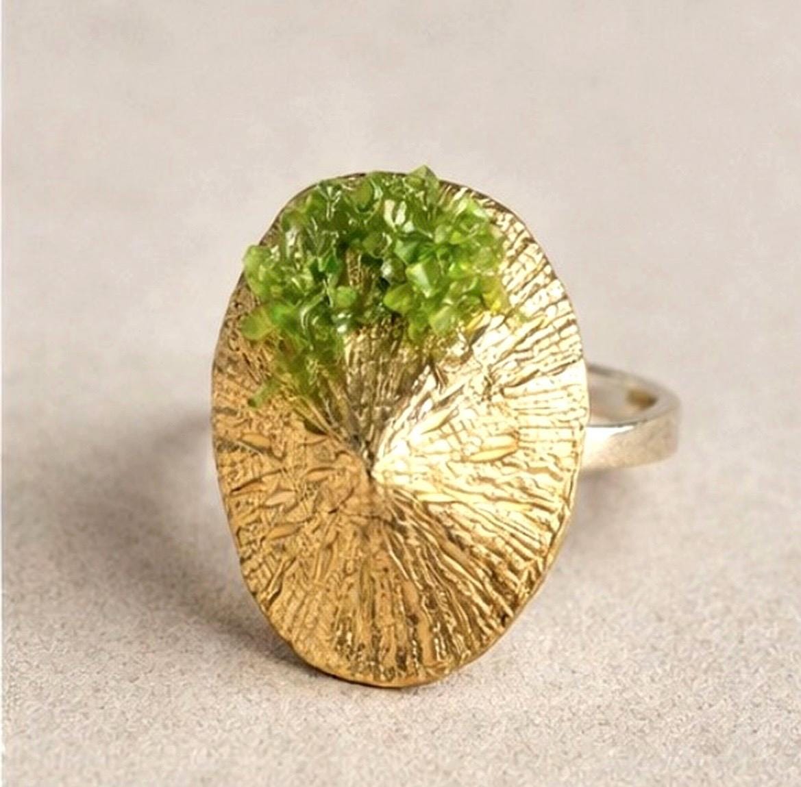 Anillo elegante,original,con piedra de peridoto ,en plata con un baño dorado.Una pieza original,con forma de lapa ,para llevar a diario ,un regalo especial,para alguien especial.