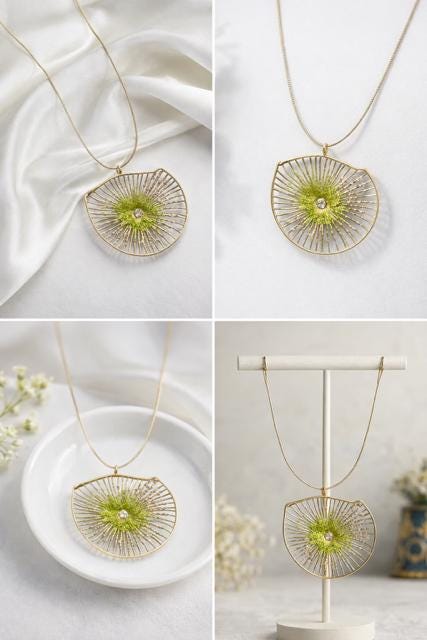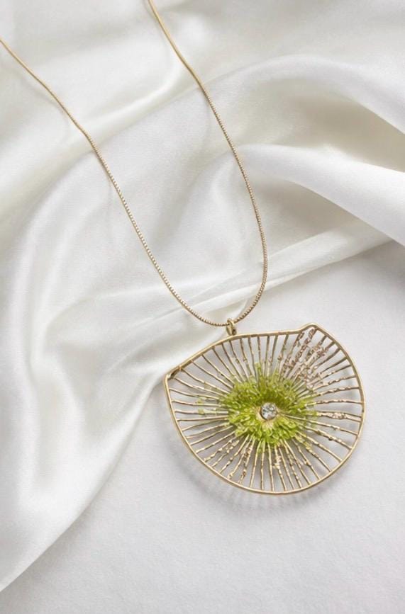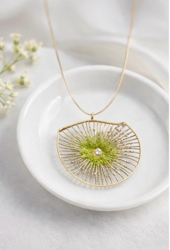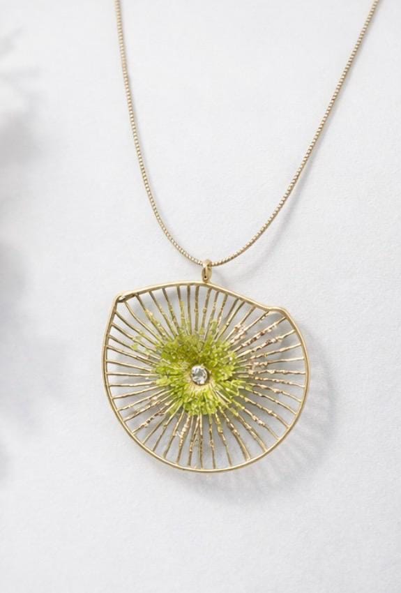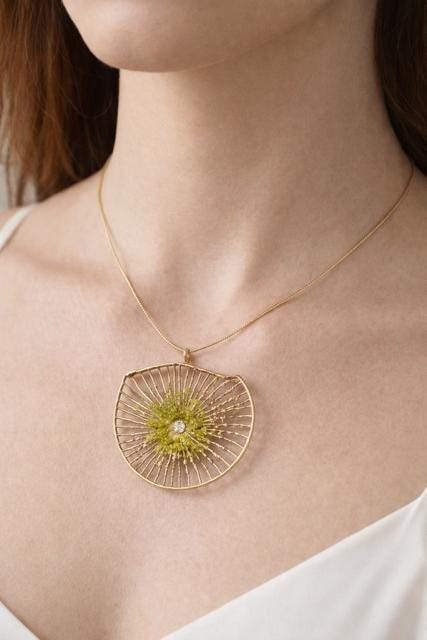 Delicado collar ,con un diseño floral,inspirado en la naturaleza,hecho en plata con un baño dorado,y adornado en el centro con peridoto(olivina),el cual aporta frescura y elegancia,regalo unico y elegante.