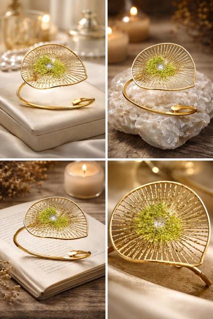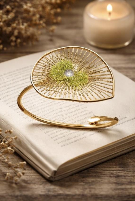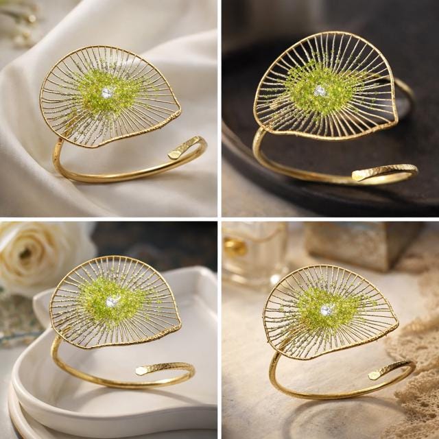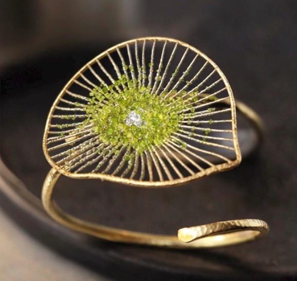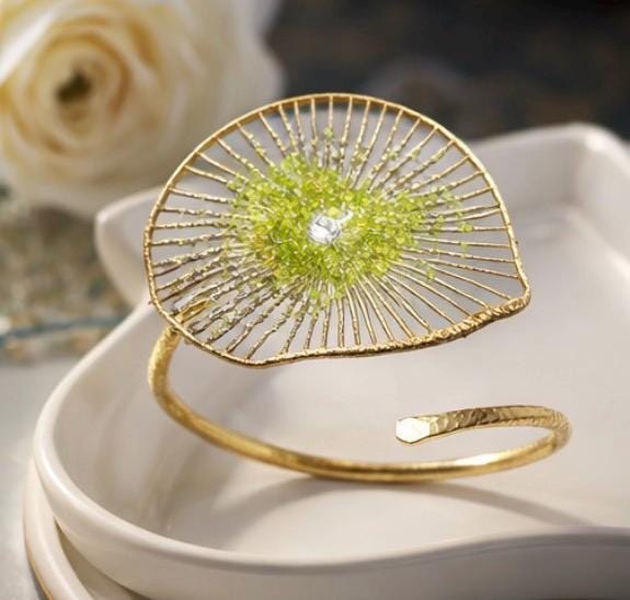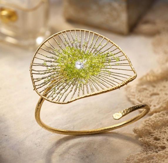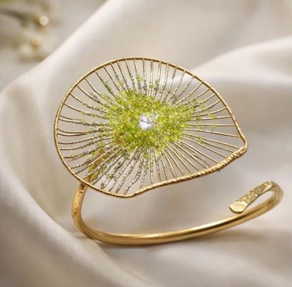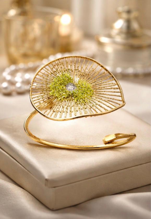Pulsera tipo brazalete ,presenta un delicado diseño floral,elaborado en plata ,con un baño dorado y peridoto natural(olivina),en el centro.EL peridoto con su tono verde aporta frescura y elegancia.
