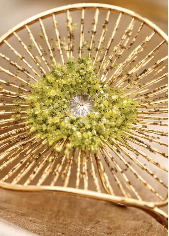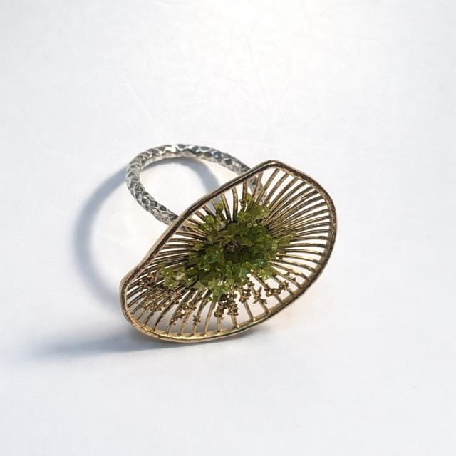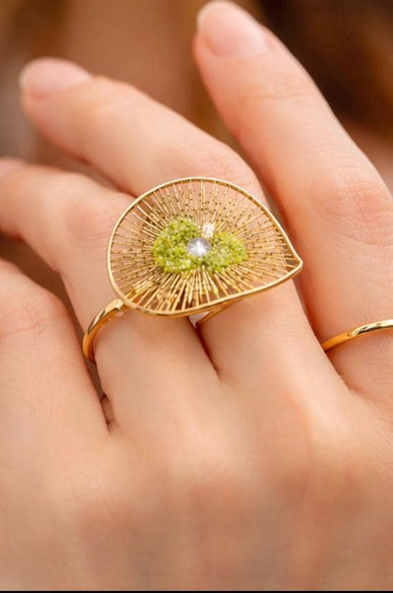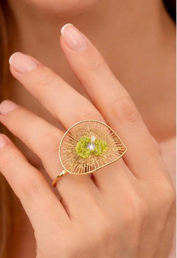 Anillo con diseño floral,elaborado en plata con un baño dorado,y decorado en el centro con peridoto(olivina).Anillo elegante y diferente,ajustable-Una pieza versatil ,para el dia a dia.-Regalo para la mujer