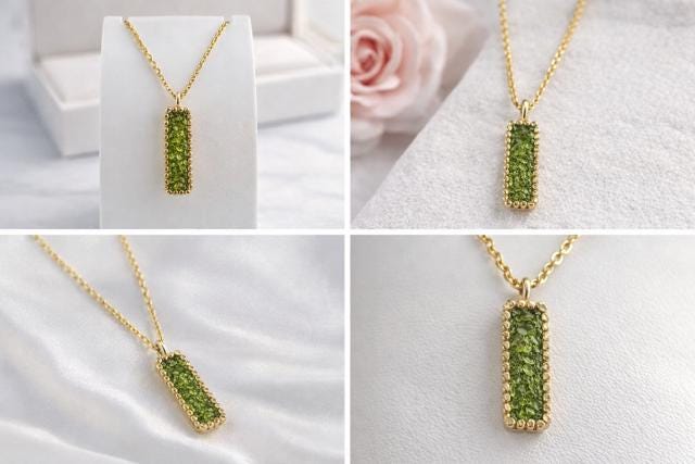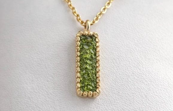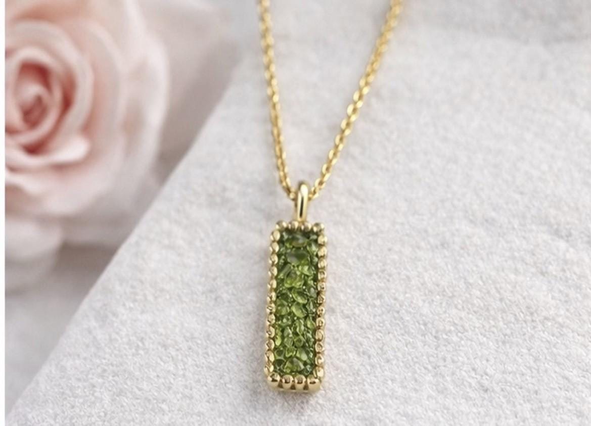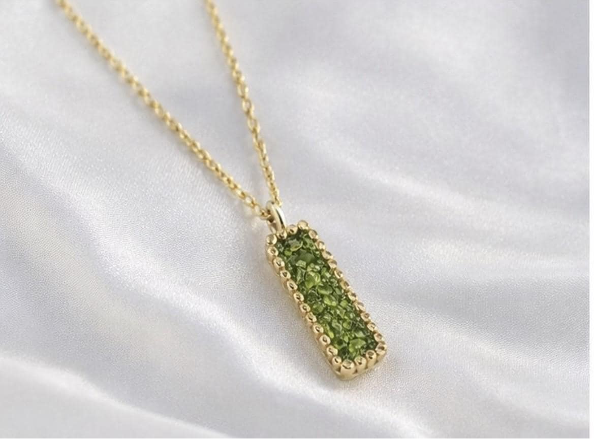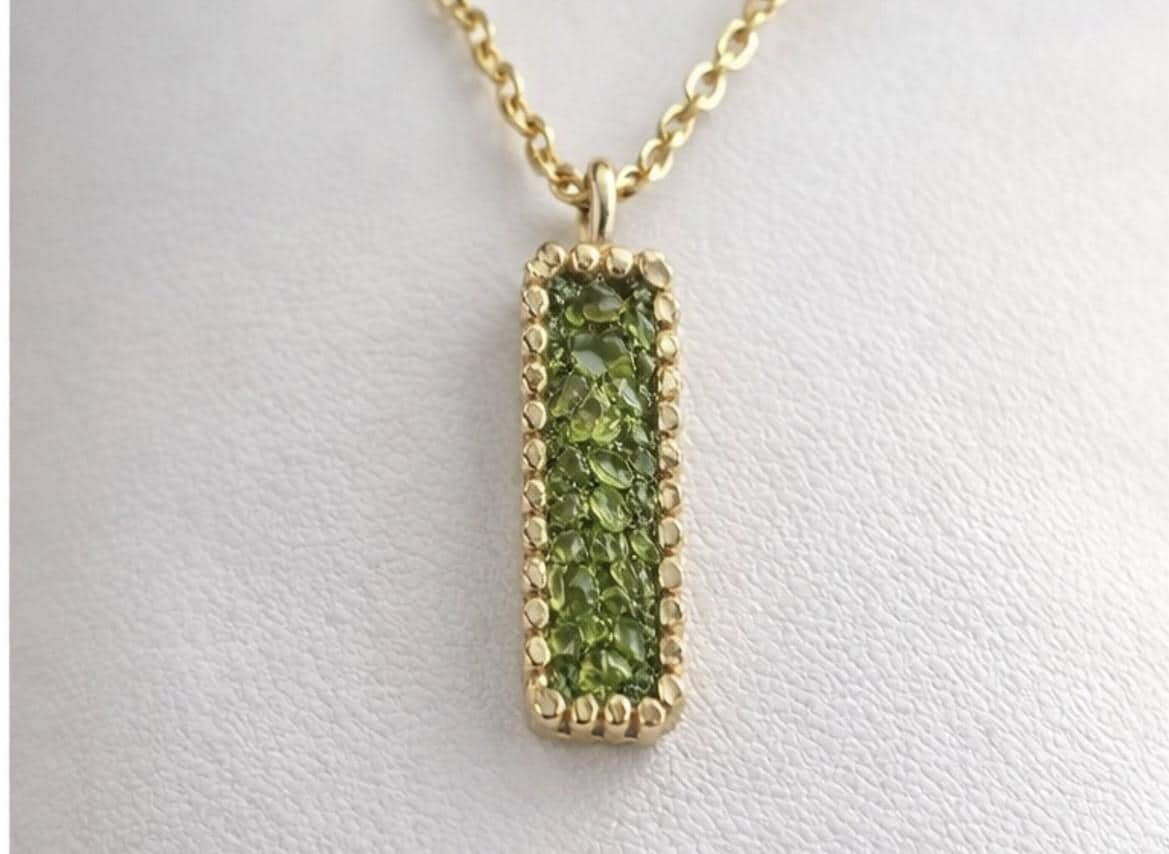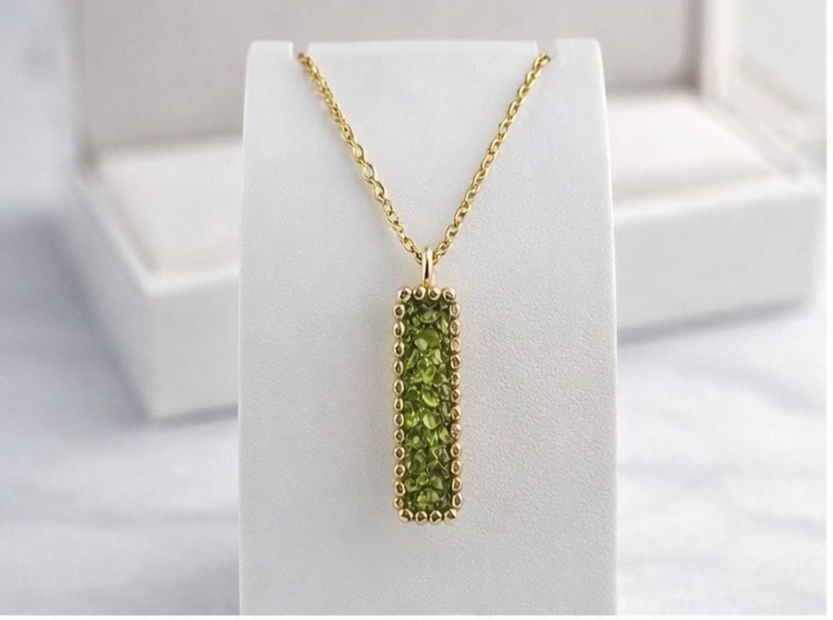 Colgante delicado y elegante rectangular,de peridoto,hecho en plata con un baño dorado.Ideal para uso diario o en ocasiones especiales.Una pieza atenporal y sofisticada,perfecta como regalo unico.
