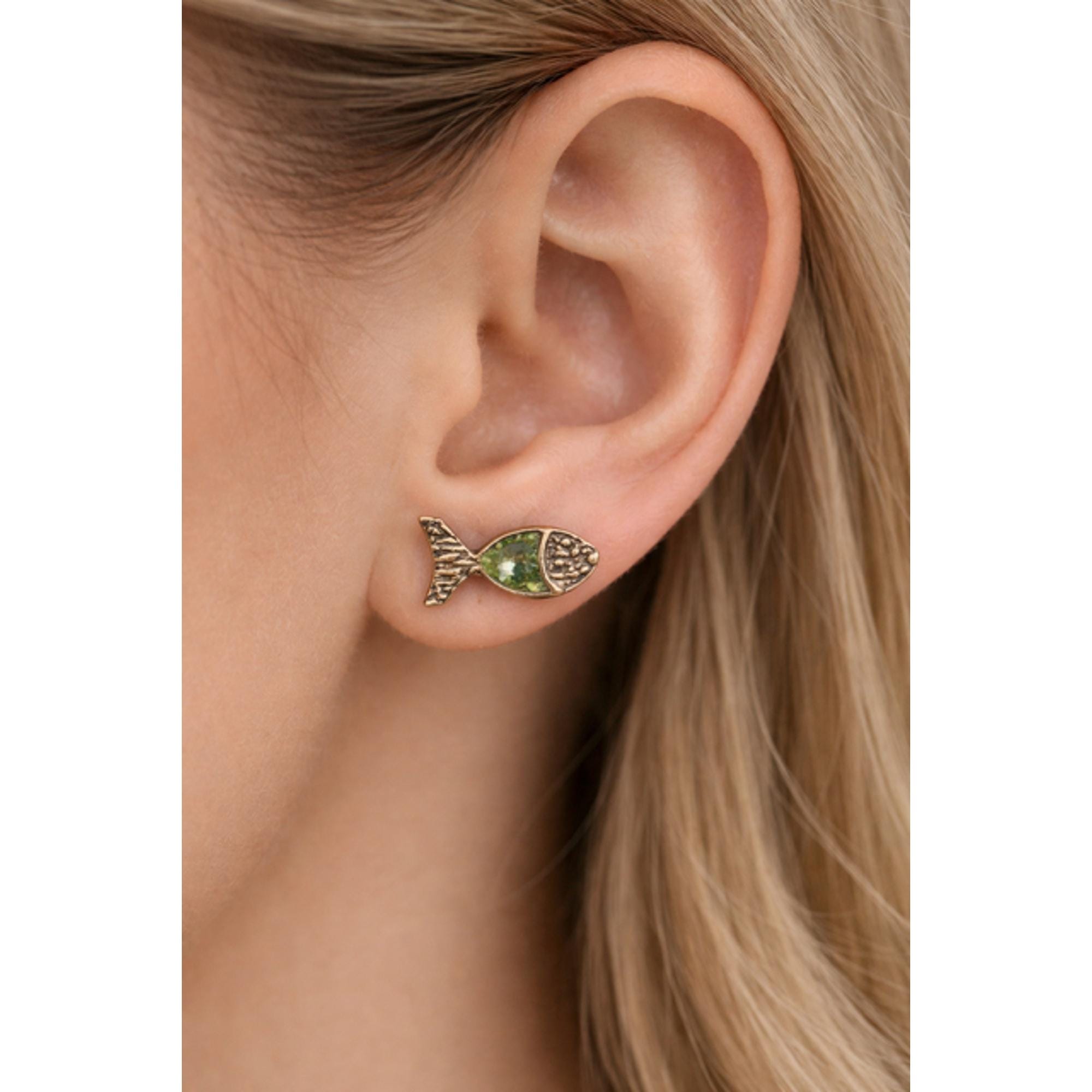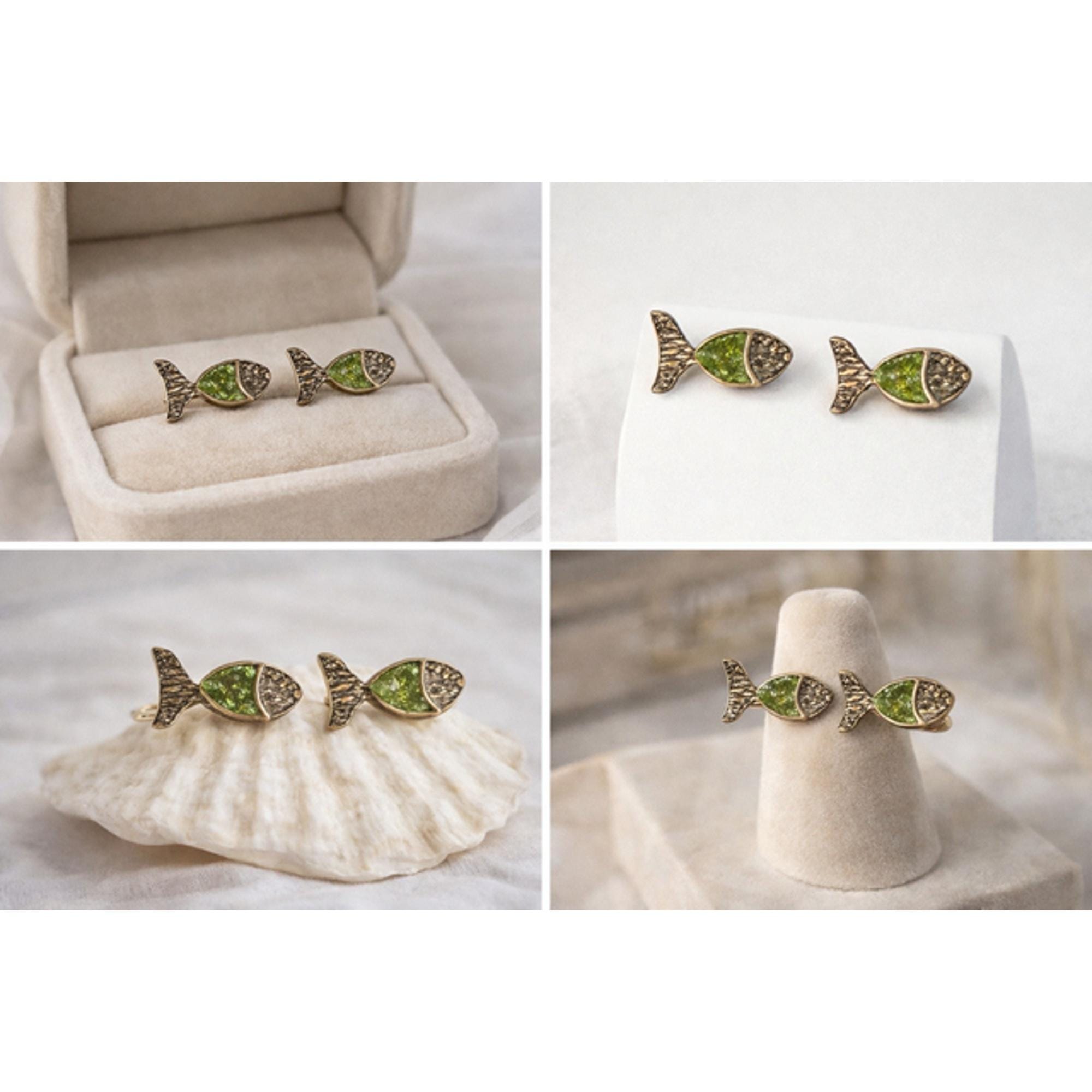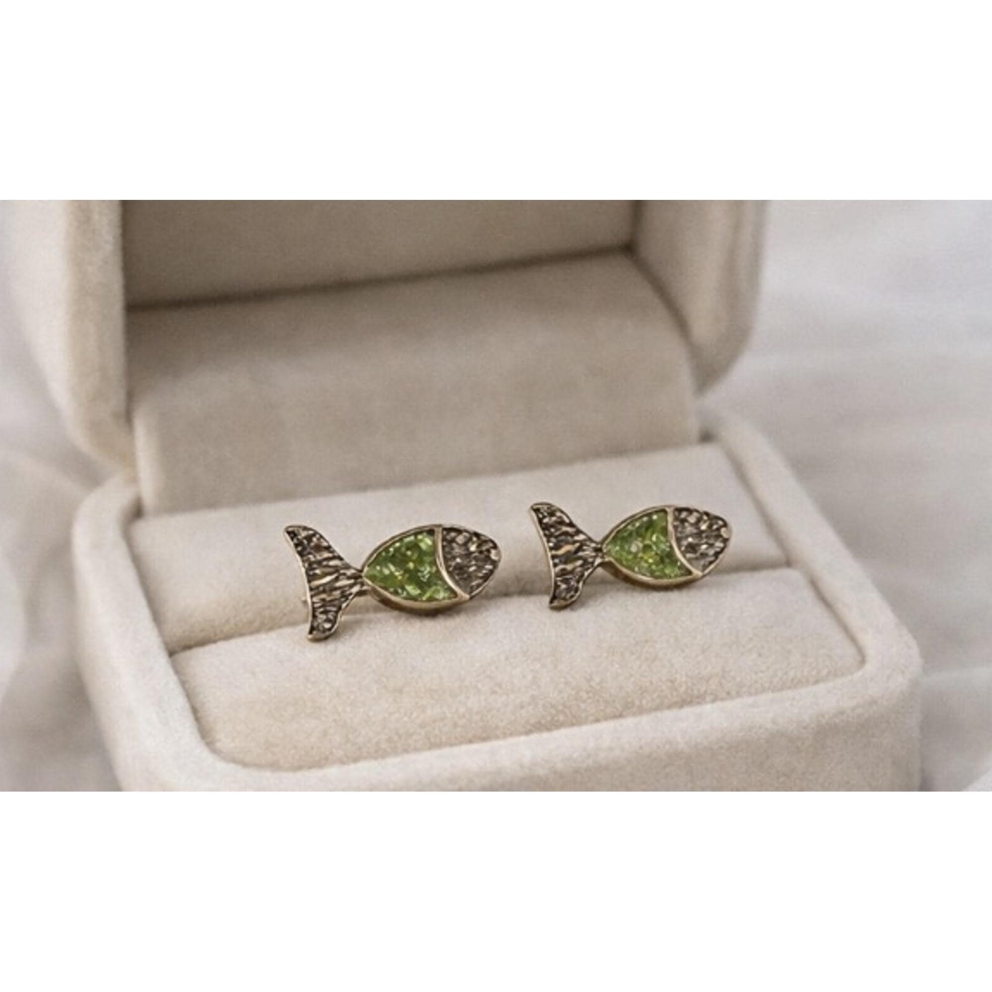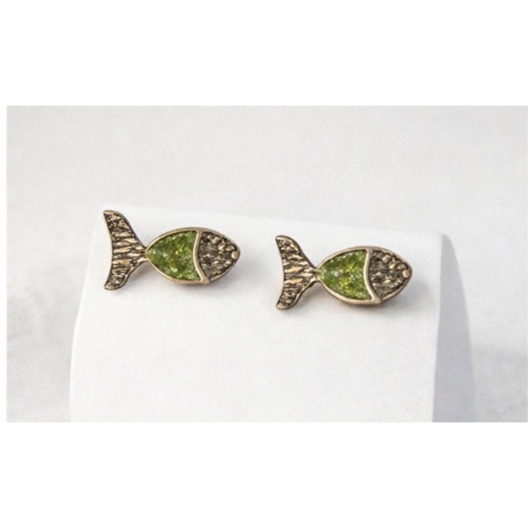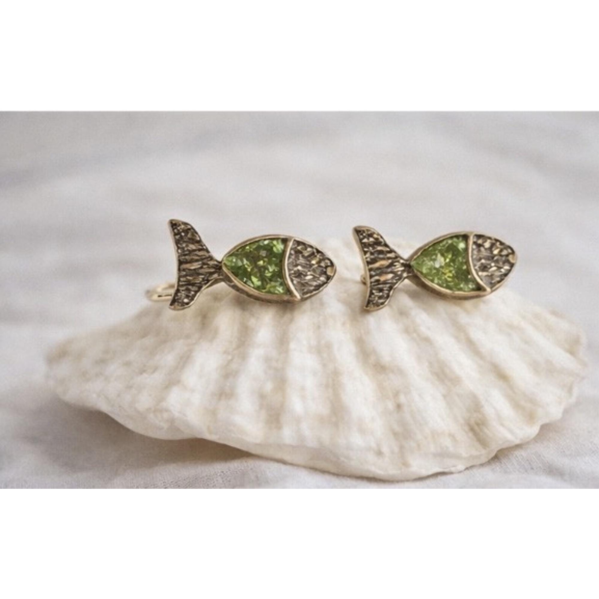 Encantadores pendientes,originales con forma de pez.Hechos a mano,en plata ,peridoto y un baño dorado-Un regalo ideal ,para los amantes de la naturaleza y accesorios diferentes.