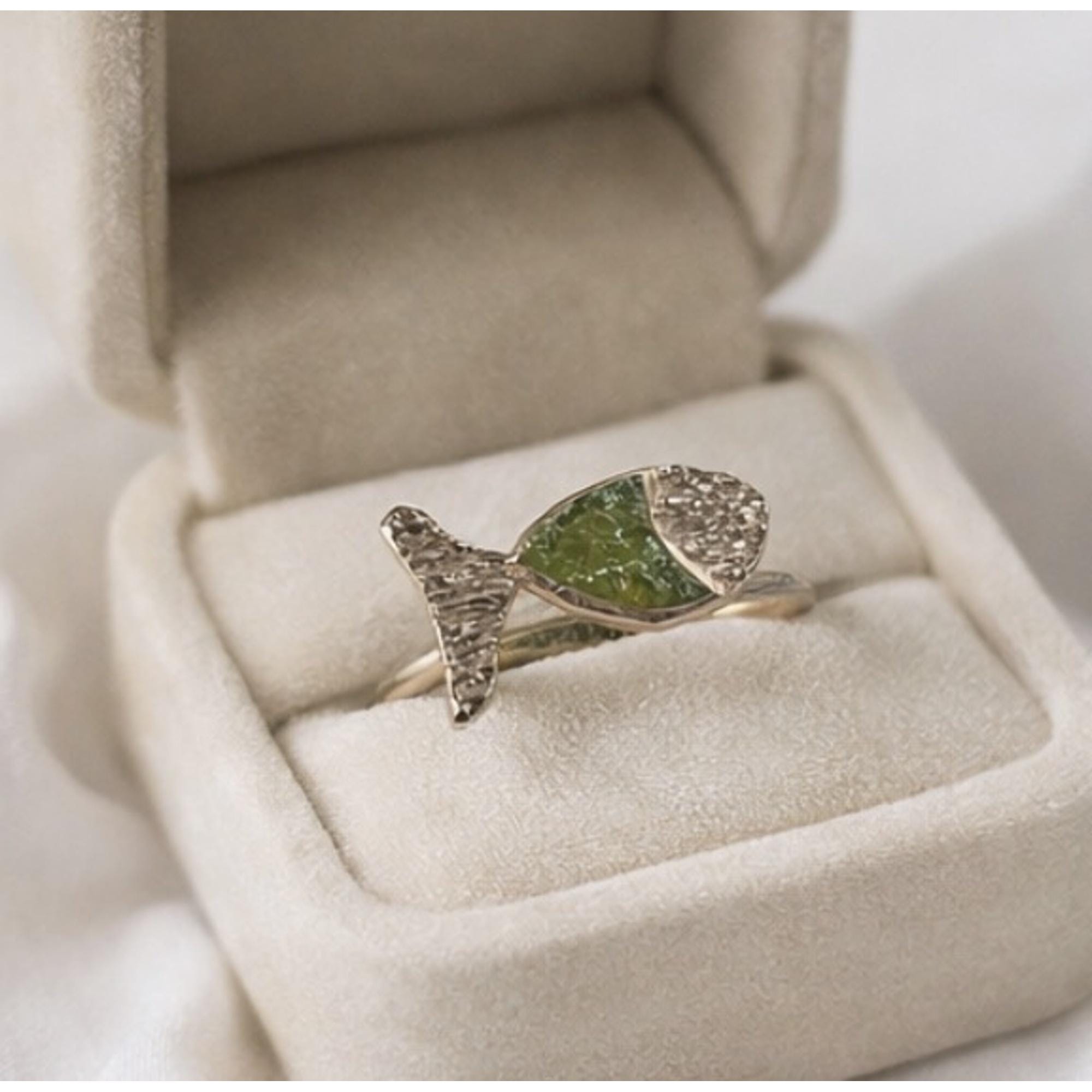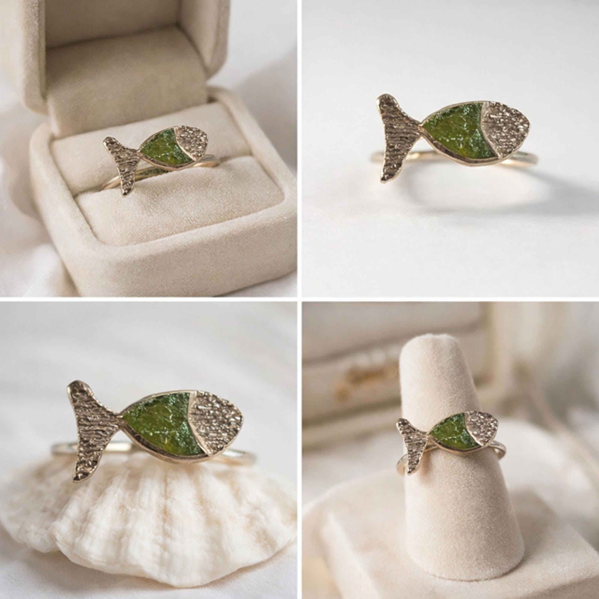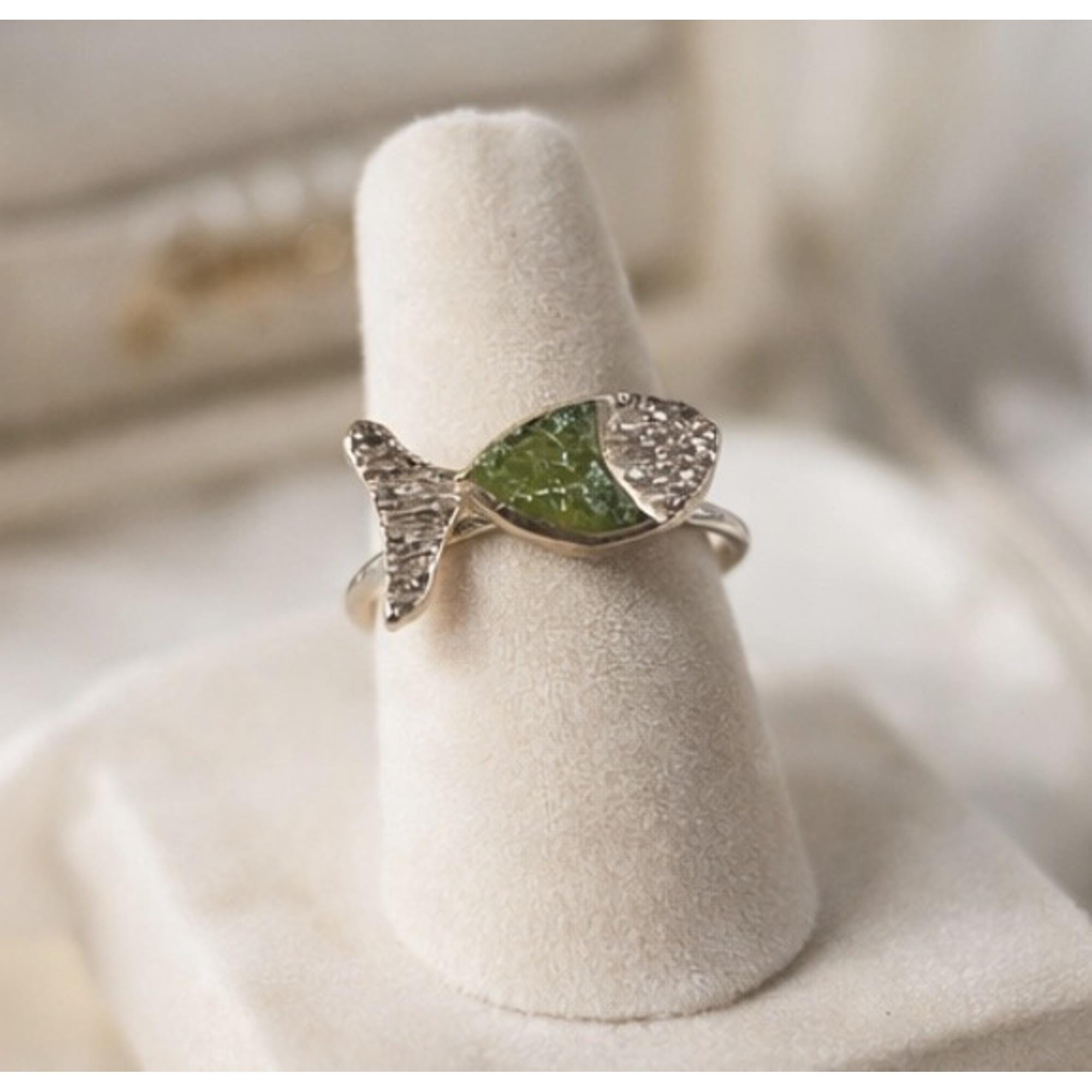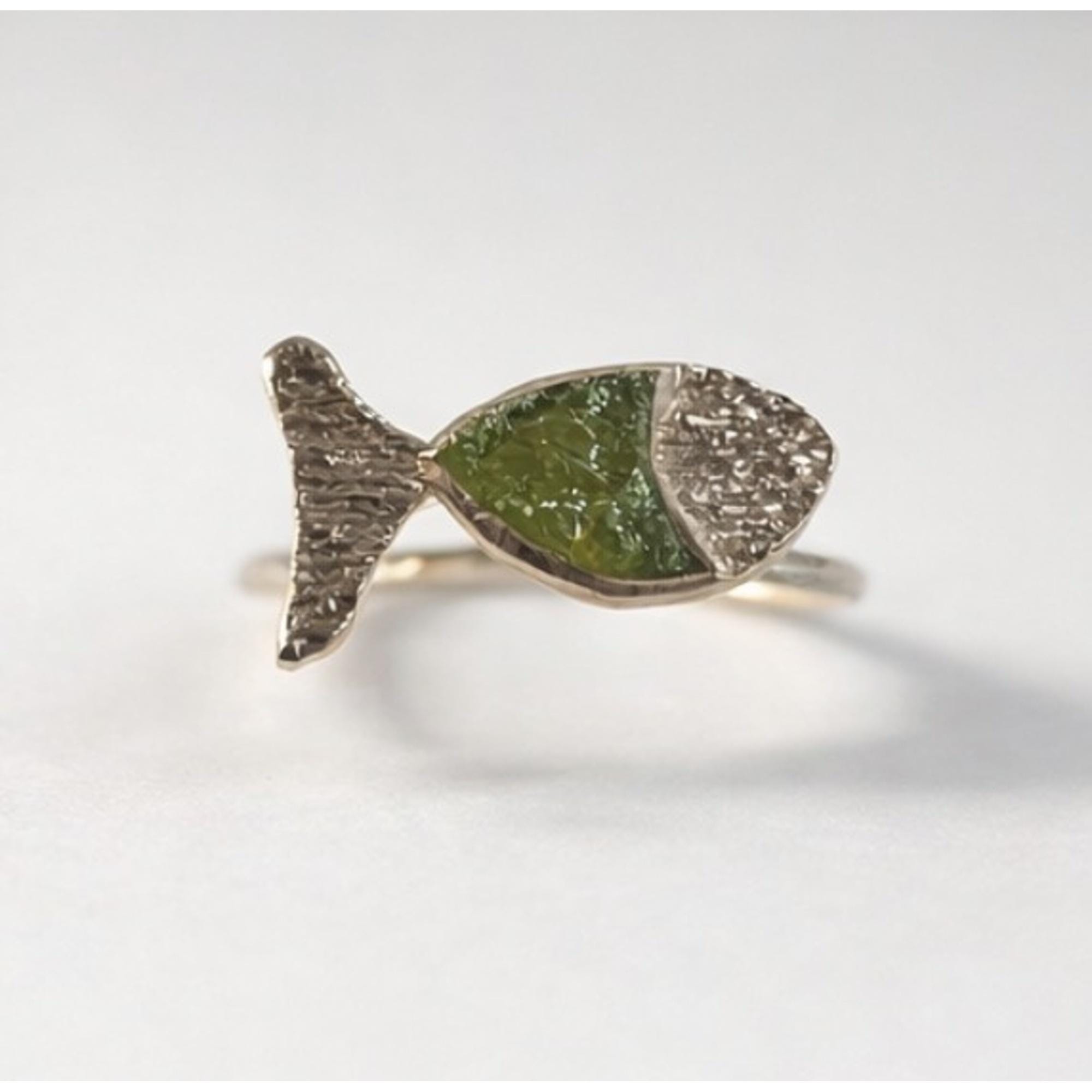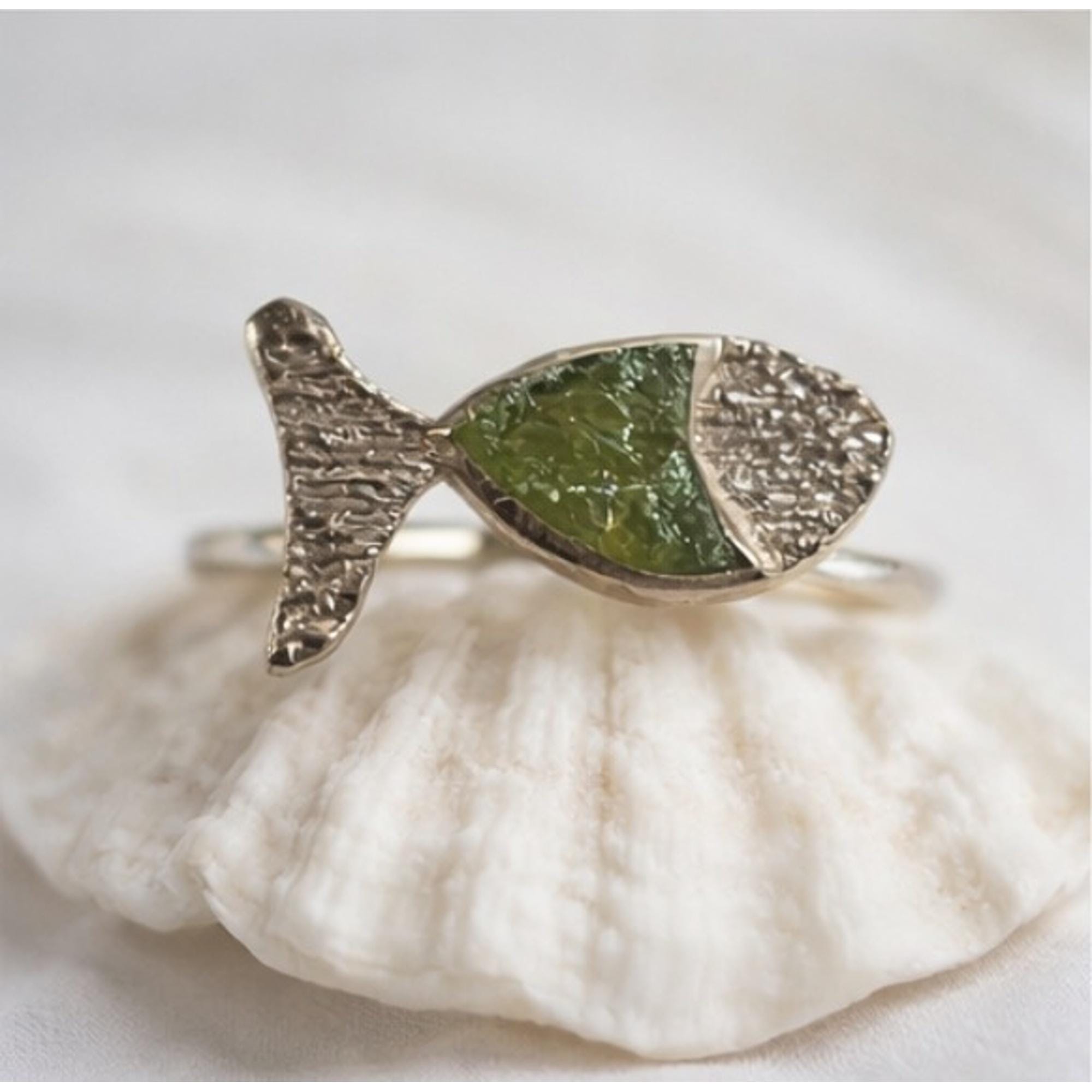 Anillo original con forma de pez,de plata con baño dorado,y peridoto(olivina)-Su diseño ajustable,lo hace comodo,perfecto,para llevar a diario.