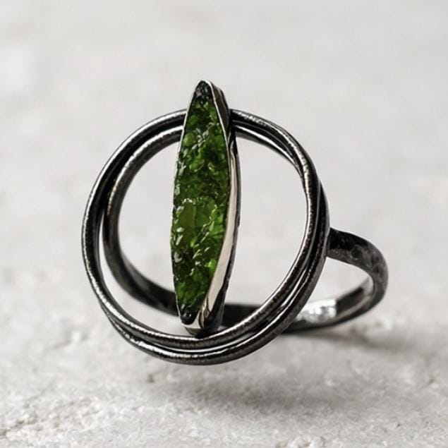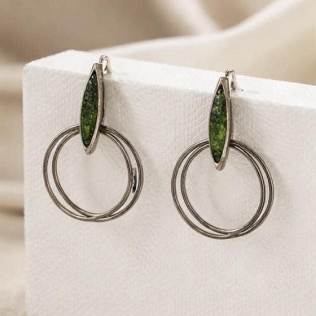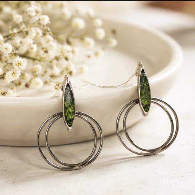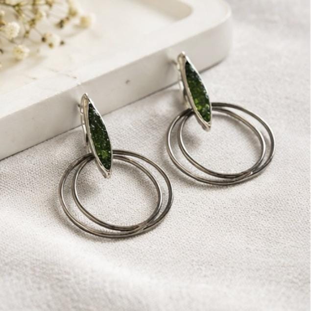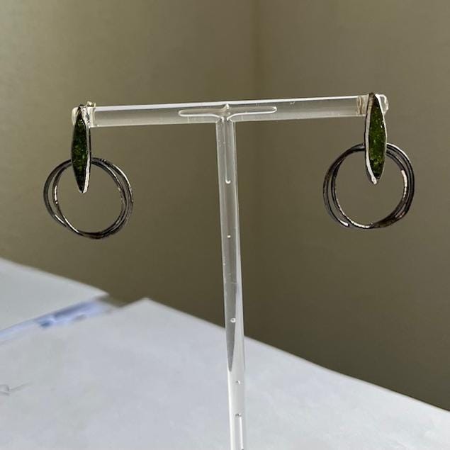 Pendientes hechos a mano en plata y cobre,adornados con peridoto(olivina)-Su diseño moderno y ligero,los hace perfecto para su uso diario-Una pieza unica que combina elegancia y estilo personal.
