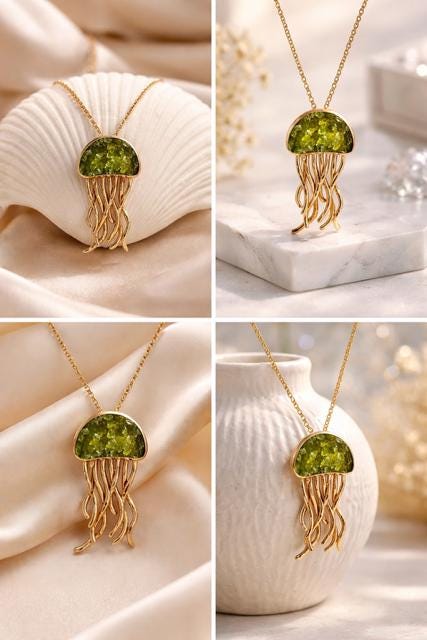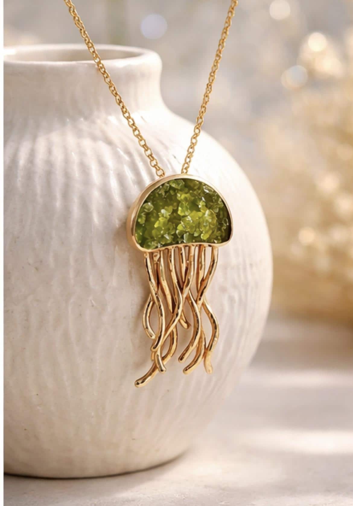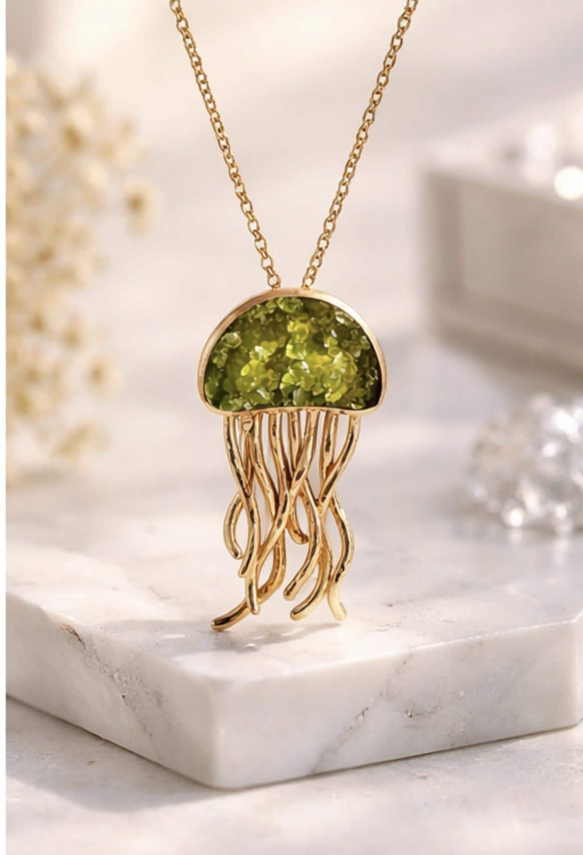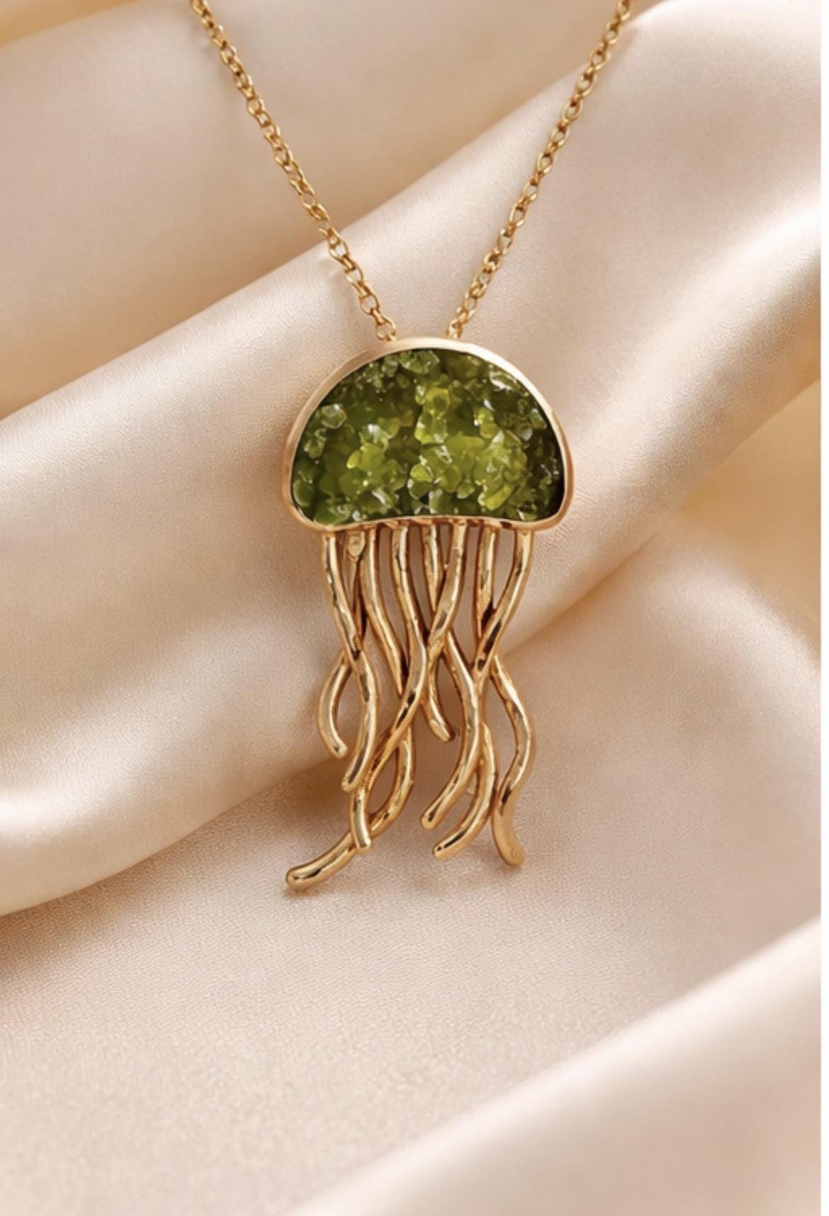 Colgante medusa artesanal,hecho en plata con un baño dorado,y piedra peridoto(olivina),es una joya elegante y artesanal,llena de personalidad.