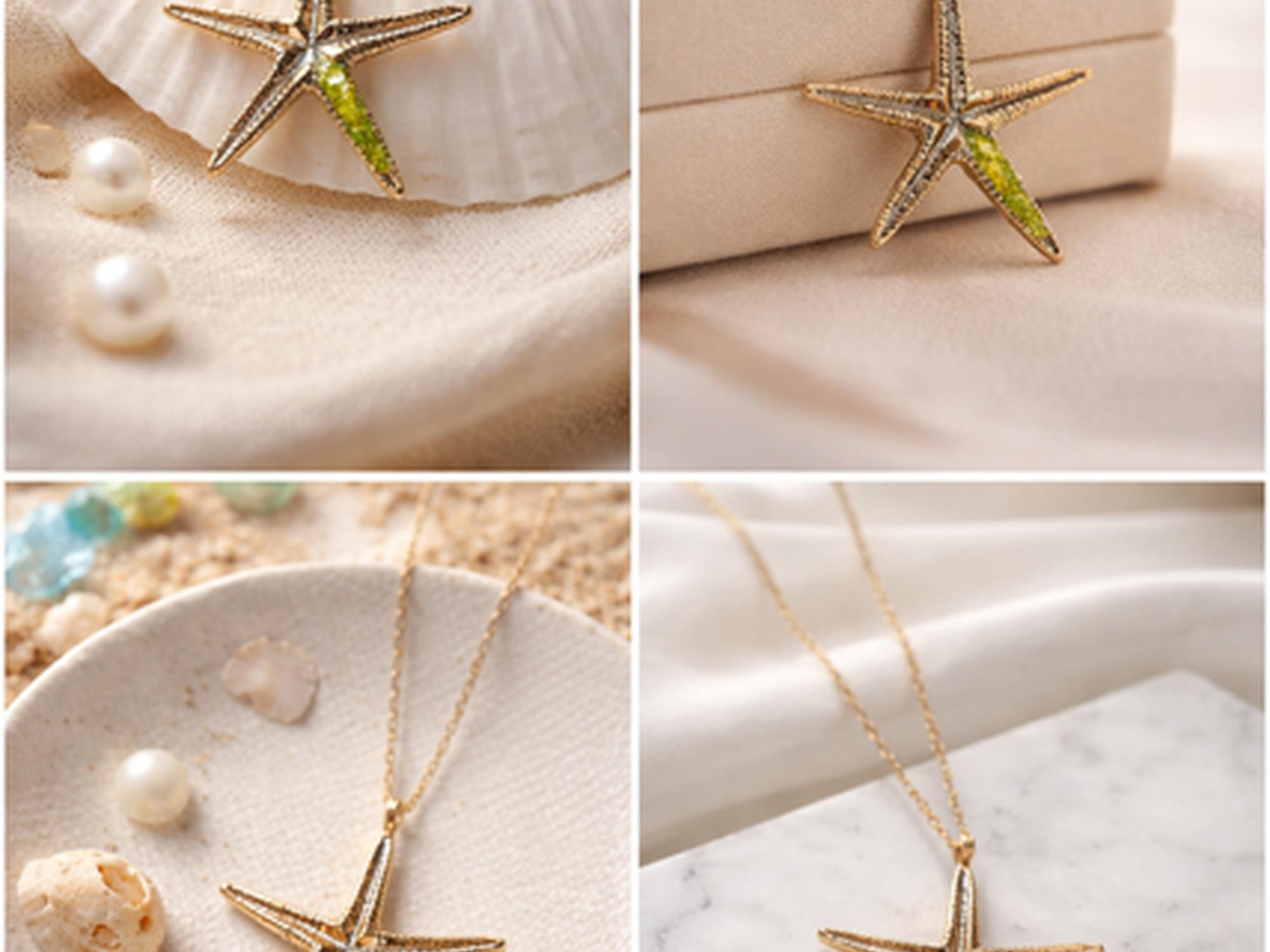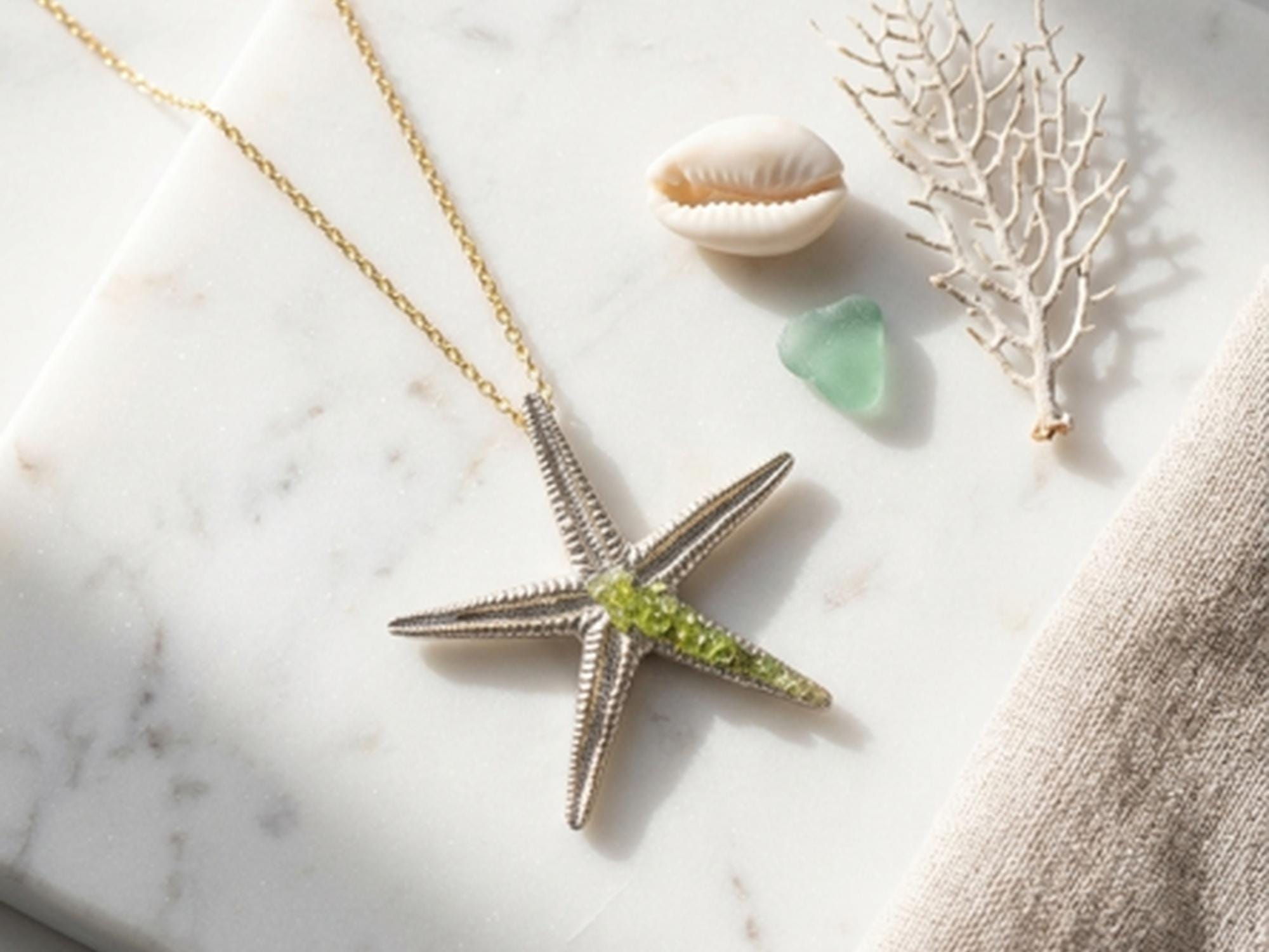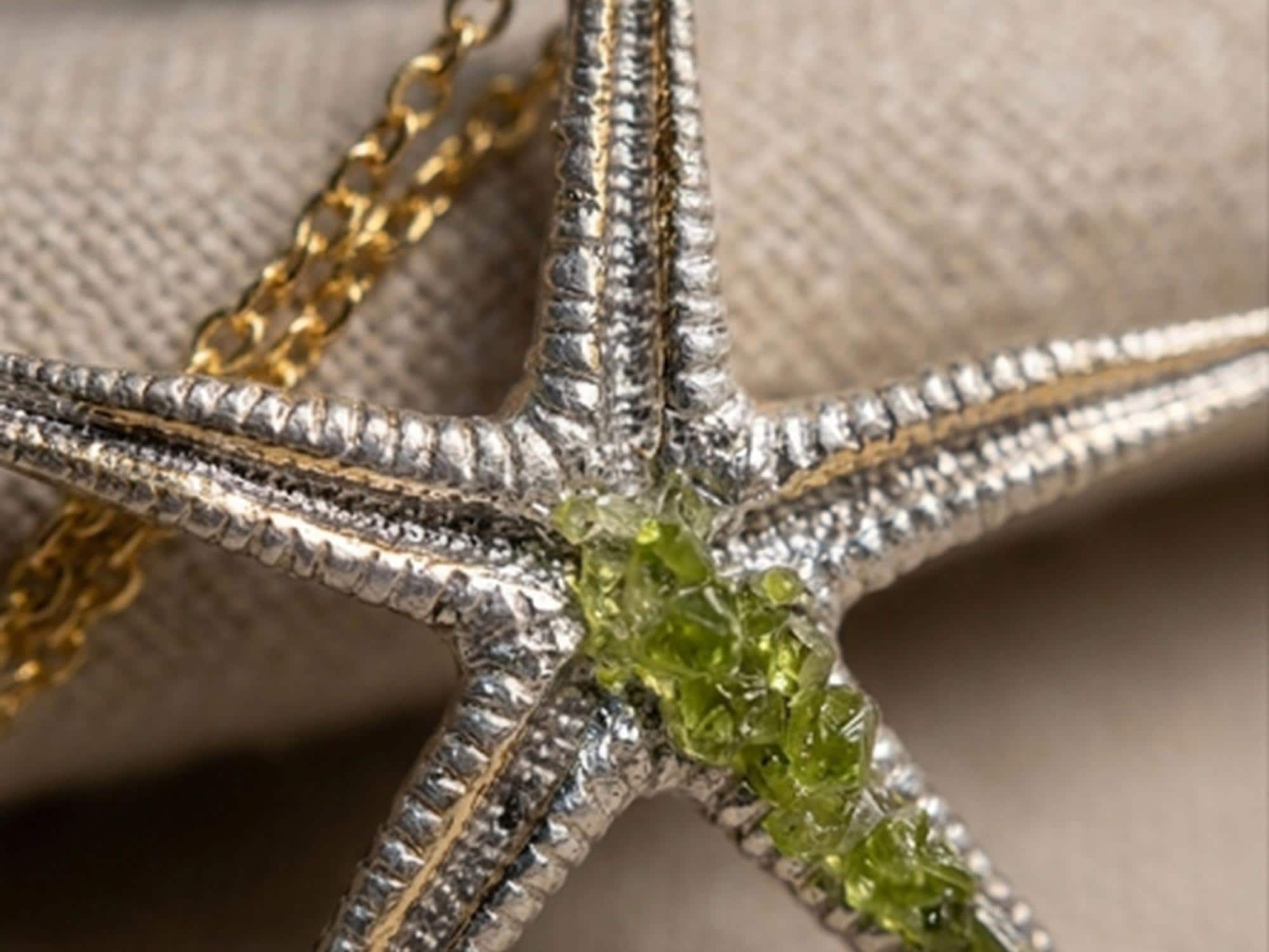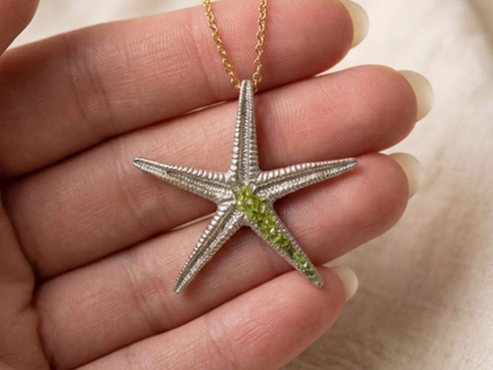 Dale un toque unico y elegante a tu estilo con este precioso collar de estrella de mar en plata ,decorado con peridoto(olivina),que aporta frescura y luminosida-Regalo para mujer.Tamaño del colgante 44mm.