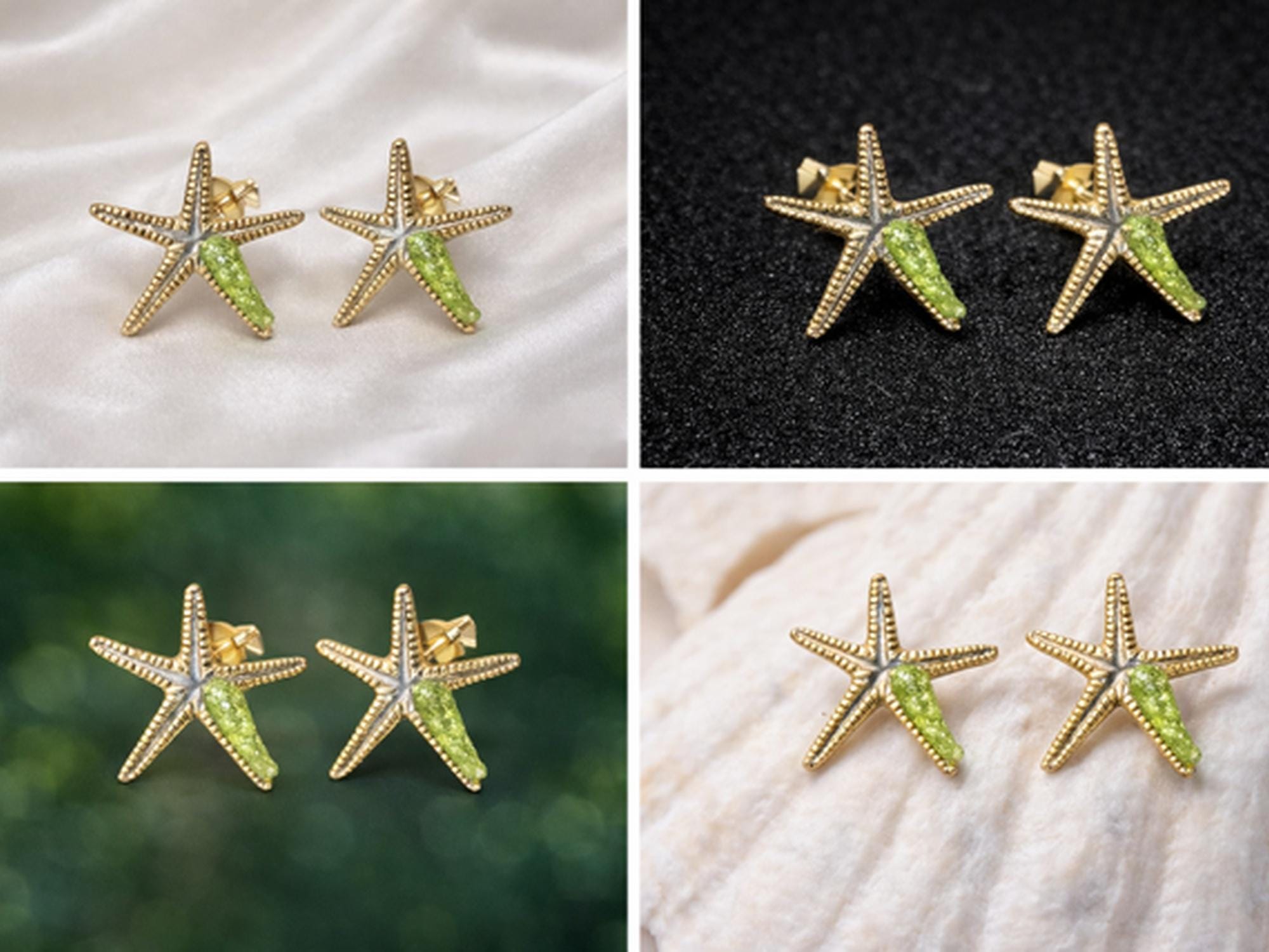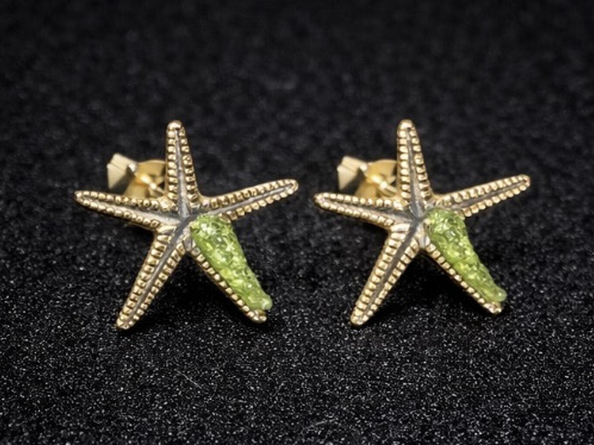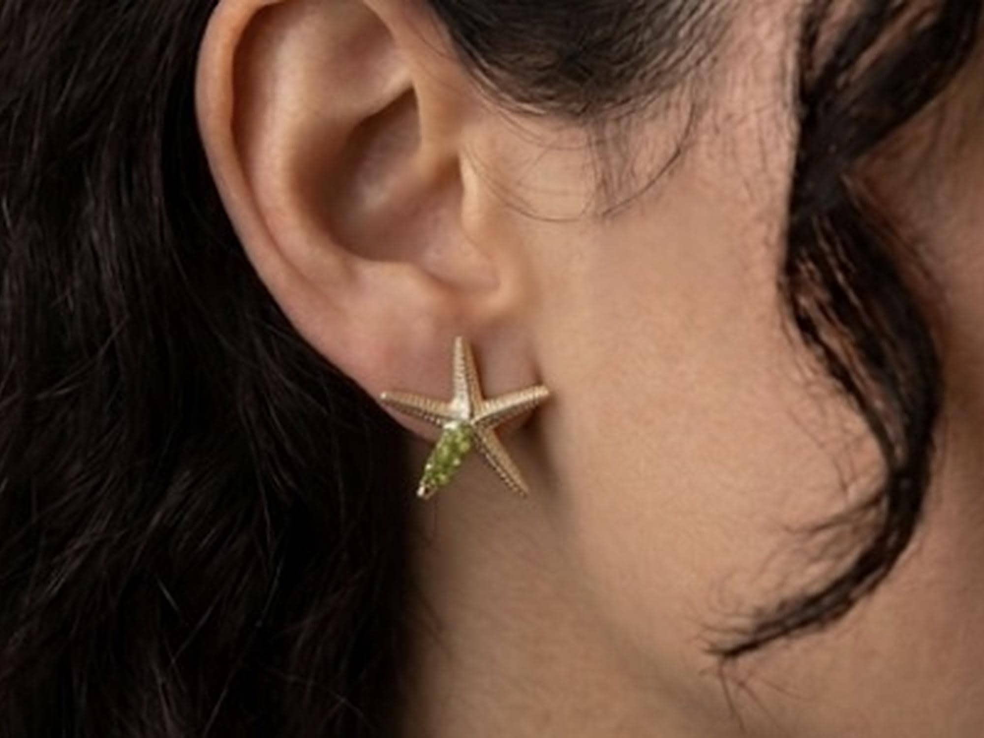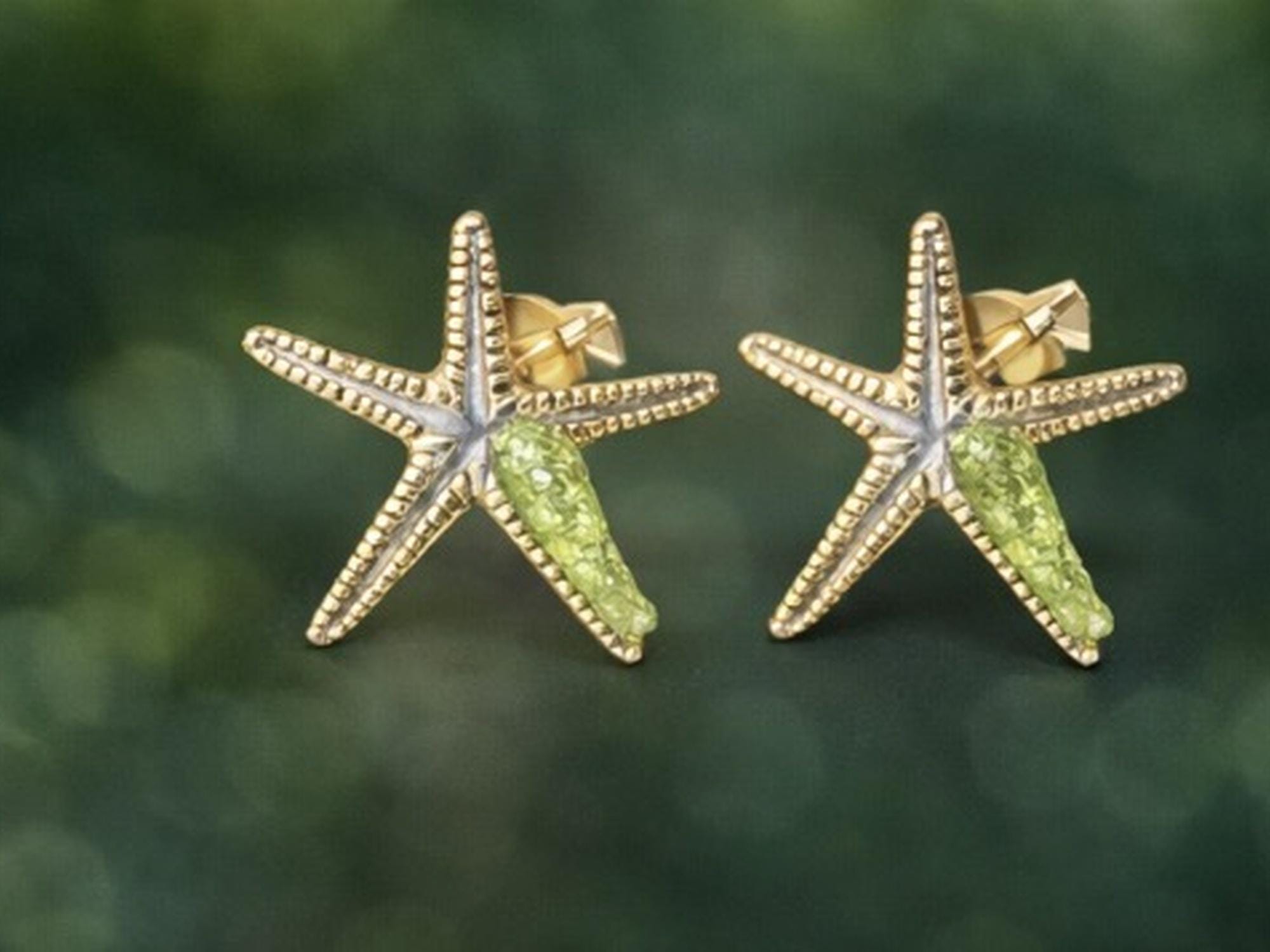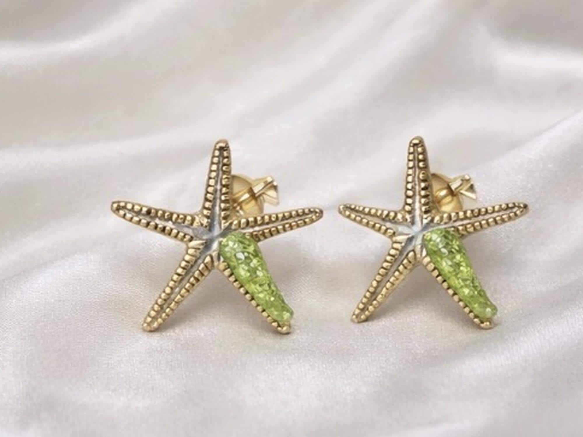 Pendiente estrella de mar ,en plata,con detalles dorados y peridoto(olivina).Un diseño inspirado en el oceano,delicado e ideal para regalar o dar un toque especial a cualquier look.