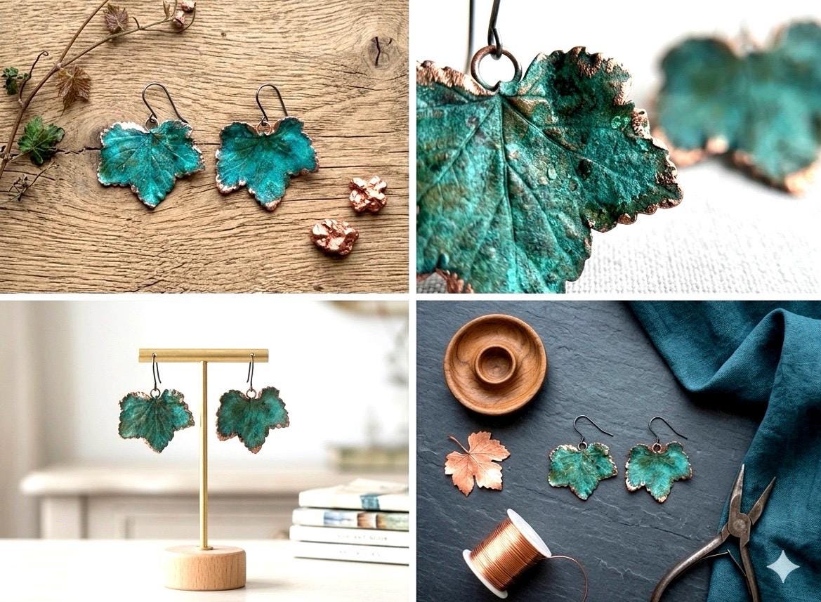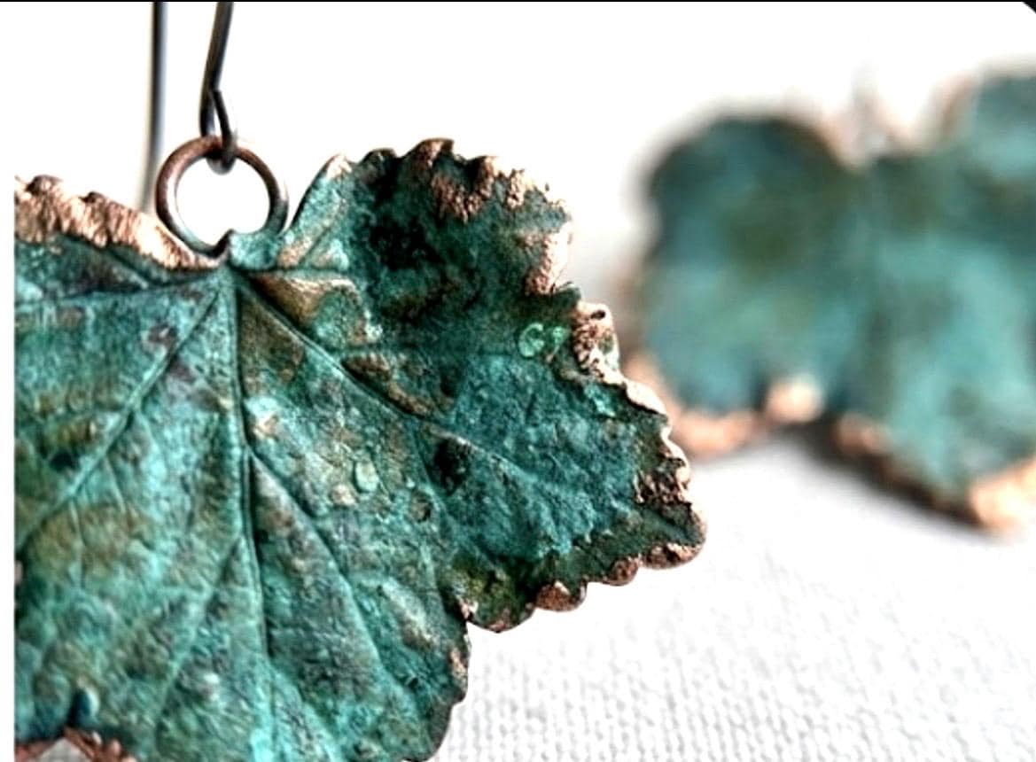 Cada pendiente ha sido creado utilizando hojas naturales auténticas, cuidadosamente tratadas y recubiertas con un baño de cobre que preserva cada detalle de su textura original. El acabado en tonos verdes con pátina aporta un estilo orgánico, elegante y completamente irrepetible.