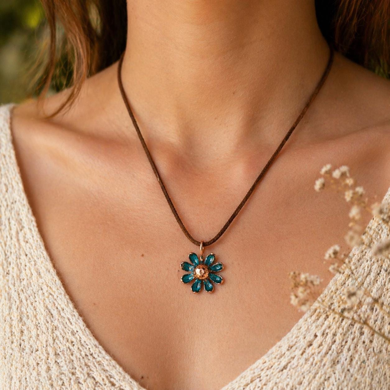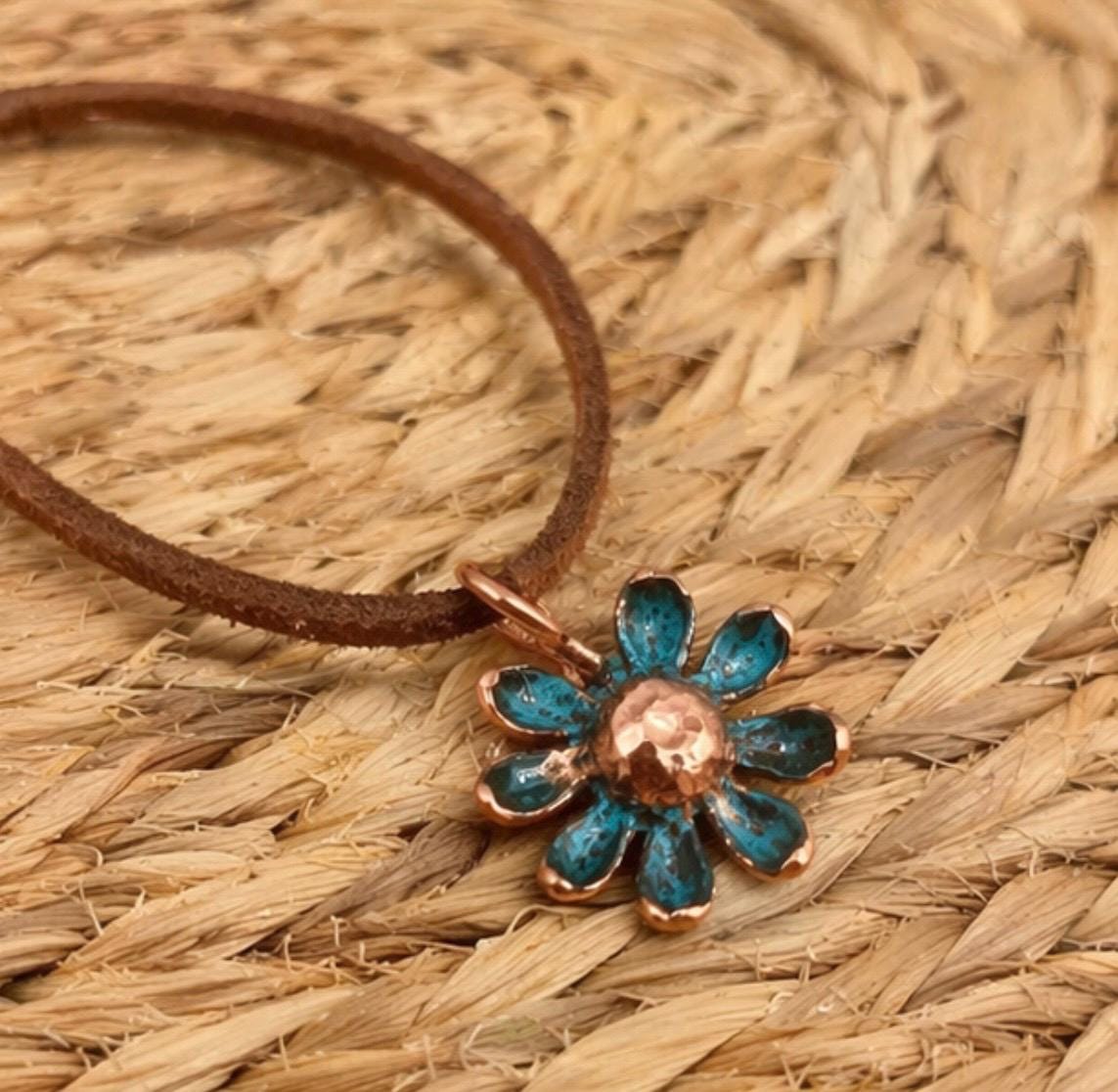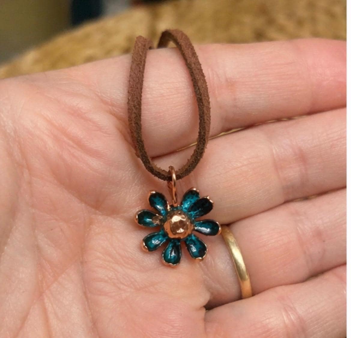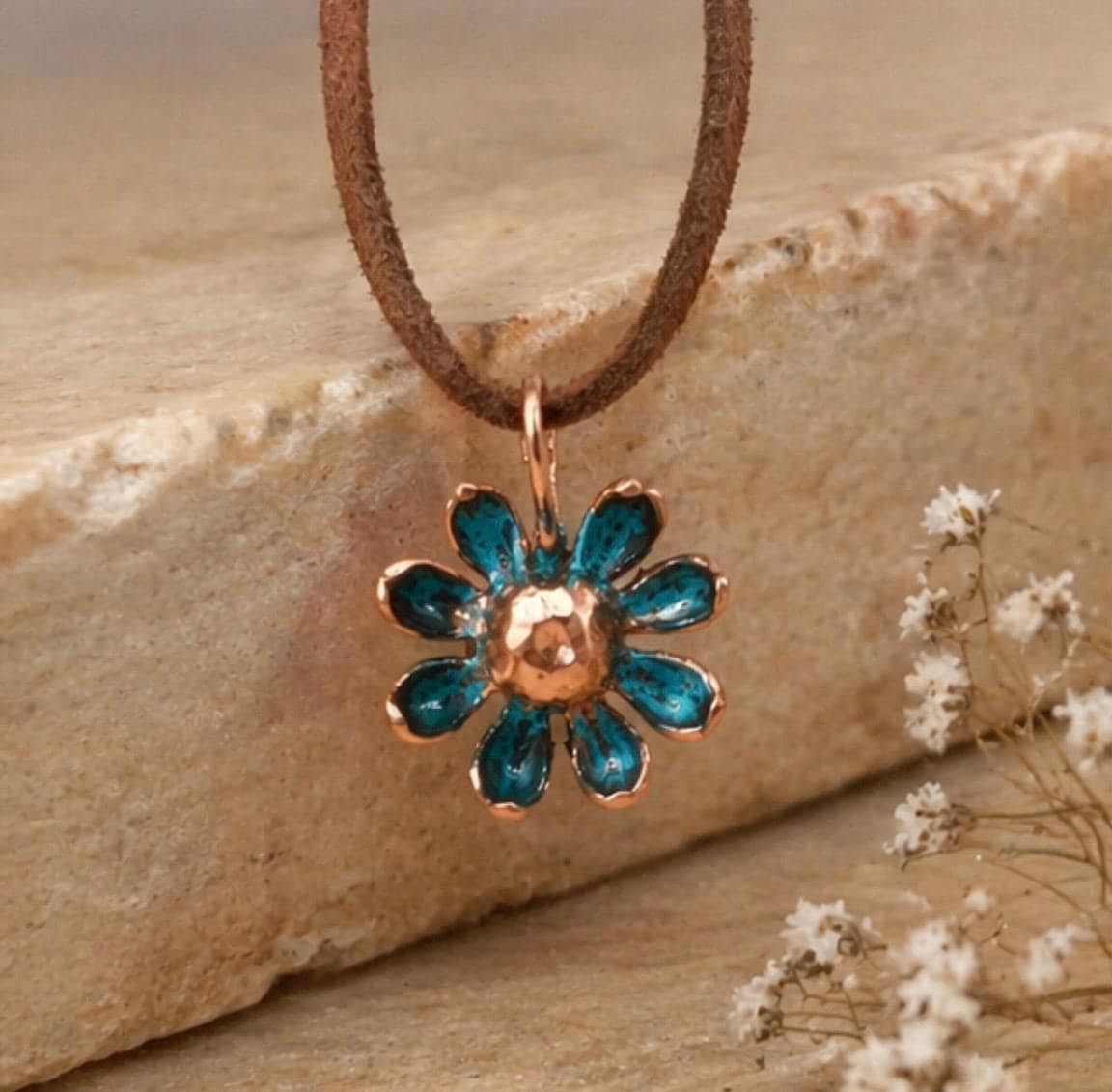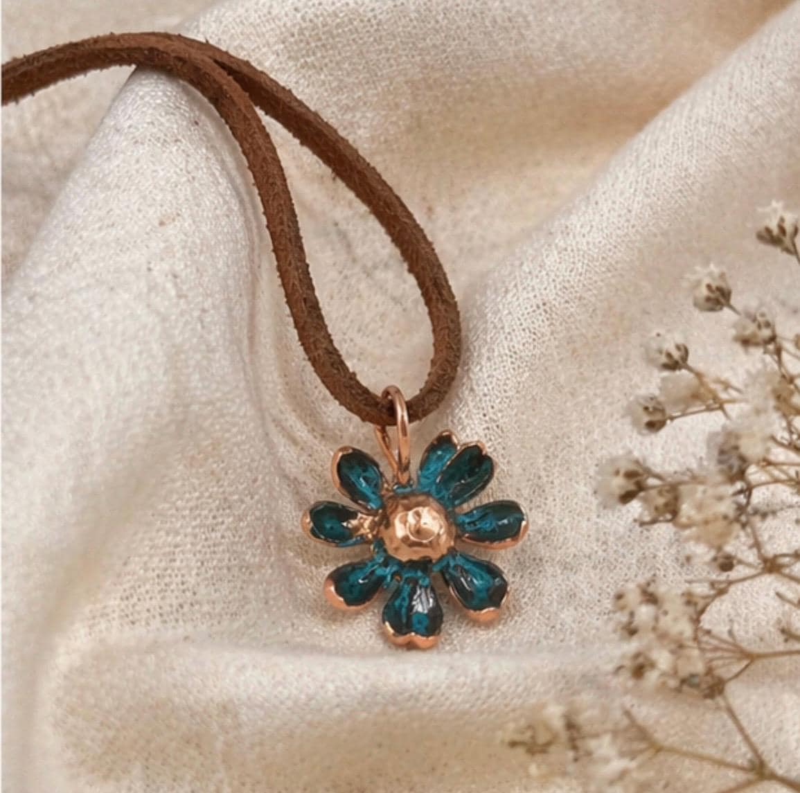 Delicado colgante elaborado a partir de una margarita natural, cuidadosamente preservada y recubierta con baño de cobre para conservar su forma y belleza única. Cada pieza es irrepetible, ideal para quienes aman la naturaleza y la joyería con alma. Perfecto como regalo especial o amuleto personal.