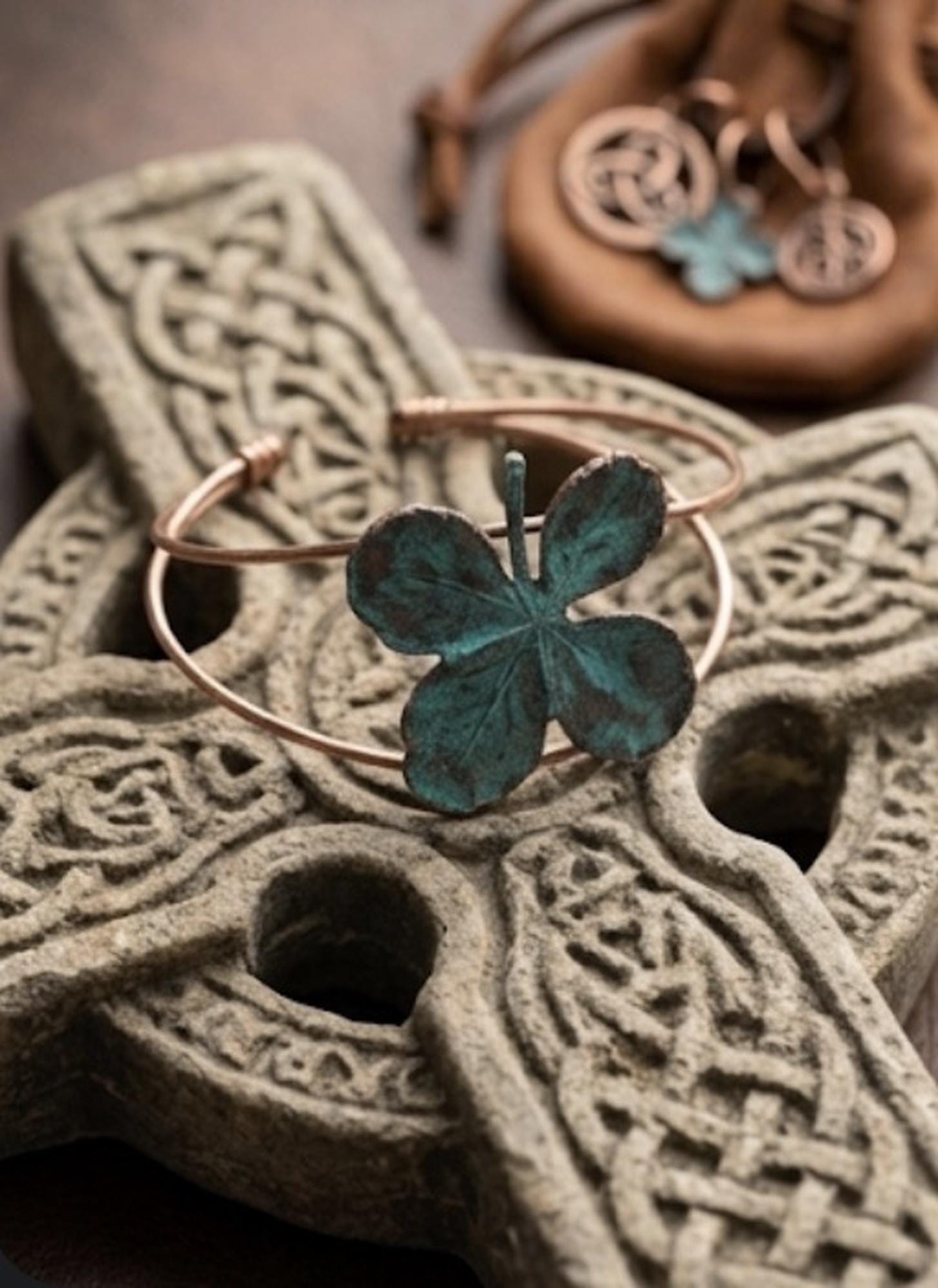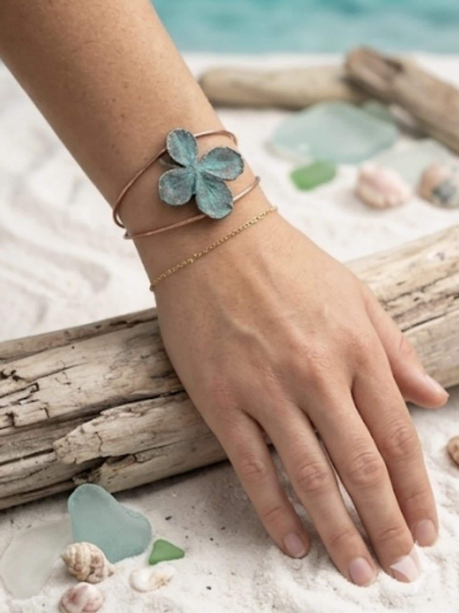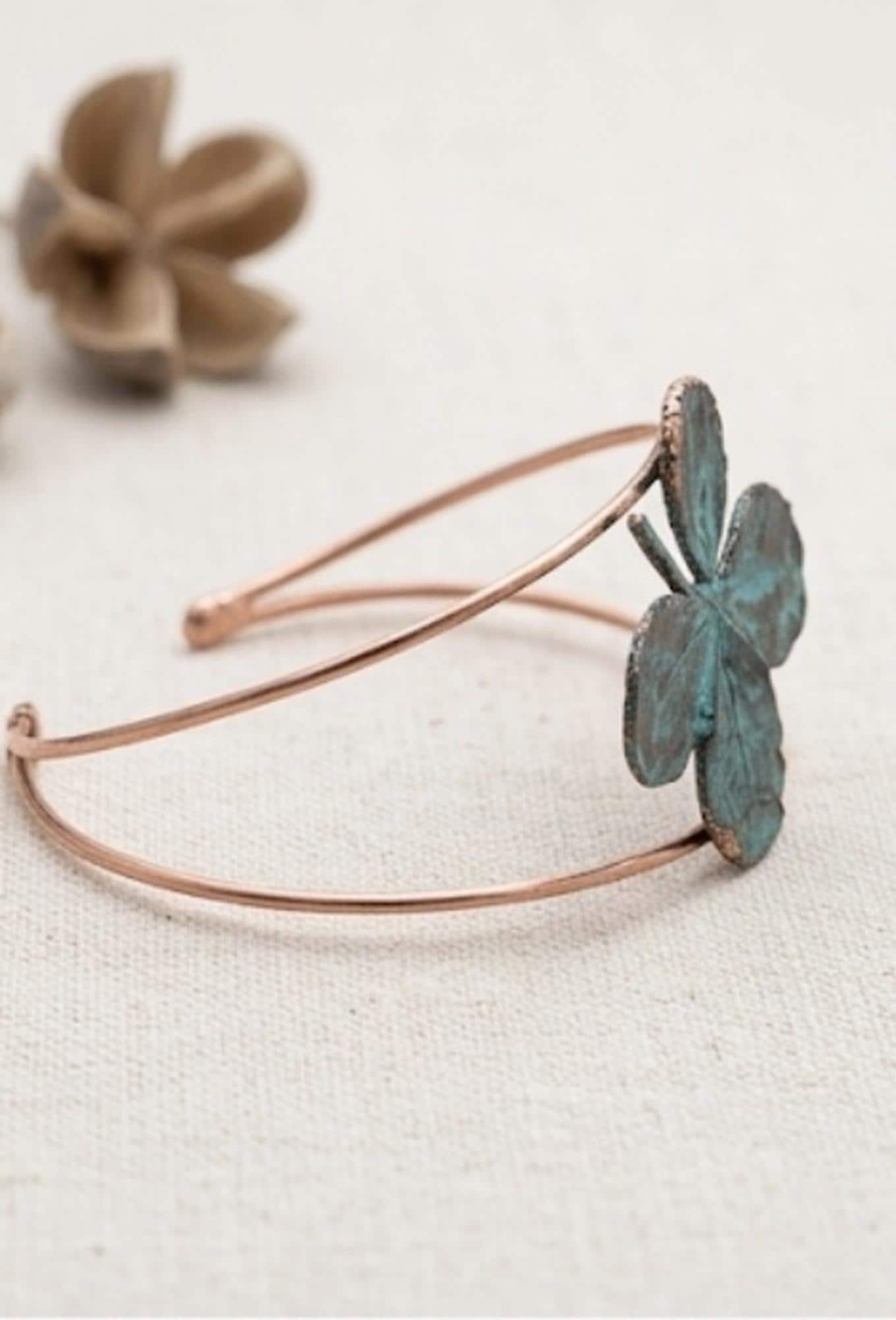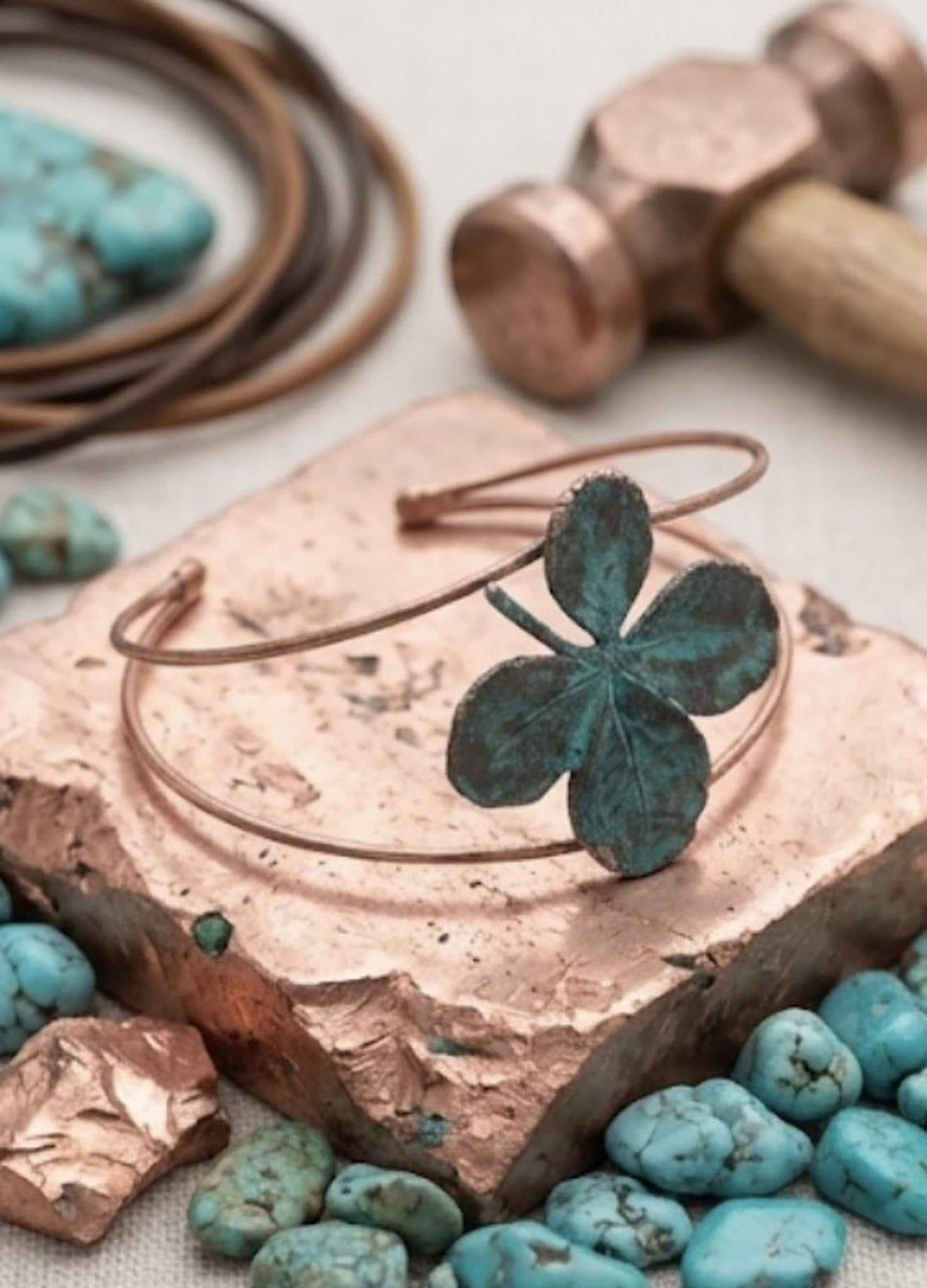 Pulsera artesanal con delicado trébol de cuatro hojas en acabado cobre, símbolo de suerte y protección. Su diseño minimalista y ajustable la hace perfecta para uso diario o como regalo especial con significado.