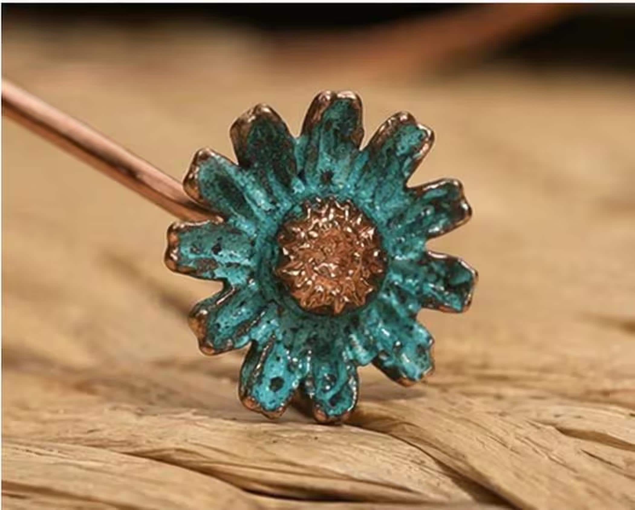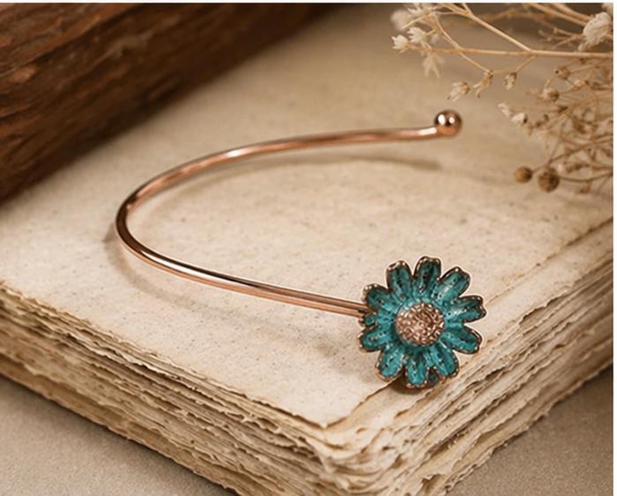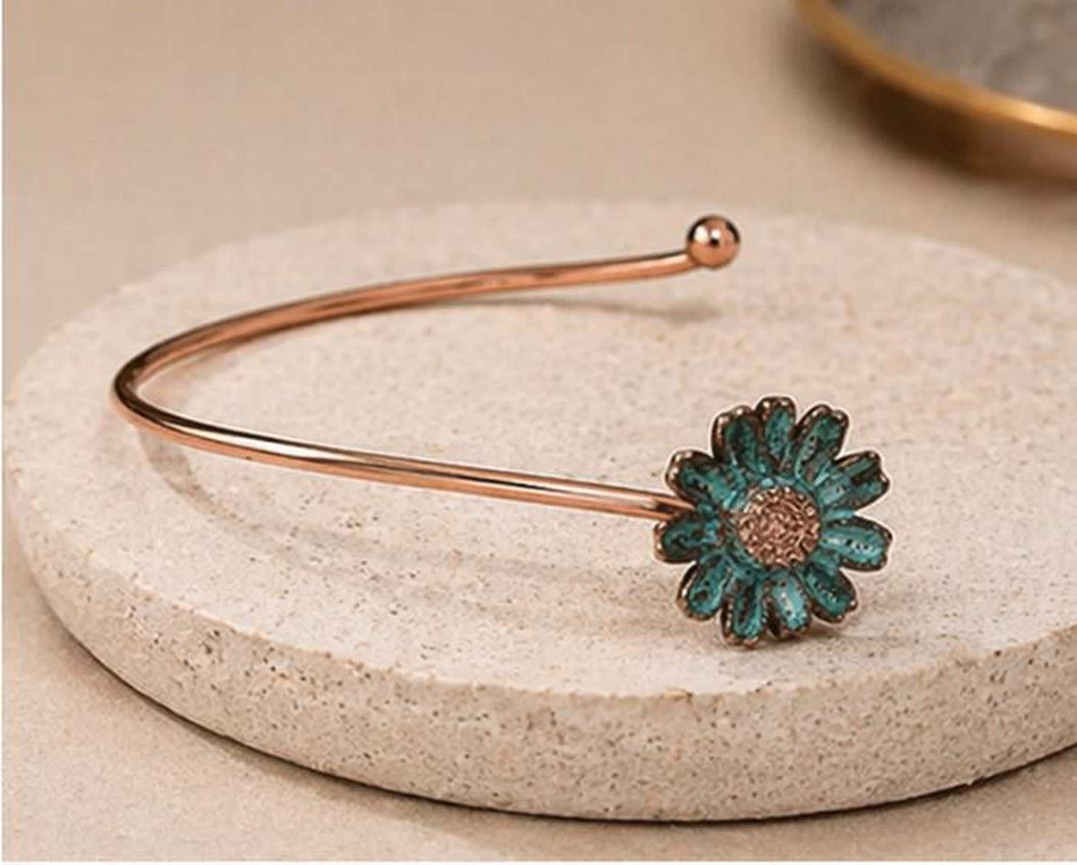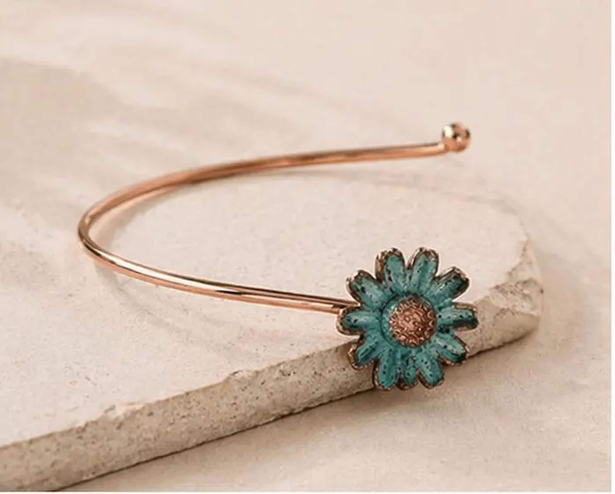 Pulsera ajustable de cobre con diseño abierto y delicada margarita turquesa en un extremo. Una pieza minimalista y elegante, hecha a mano, perfecta para el día a día o como regalo especial.