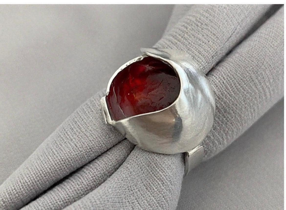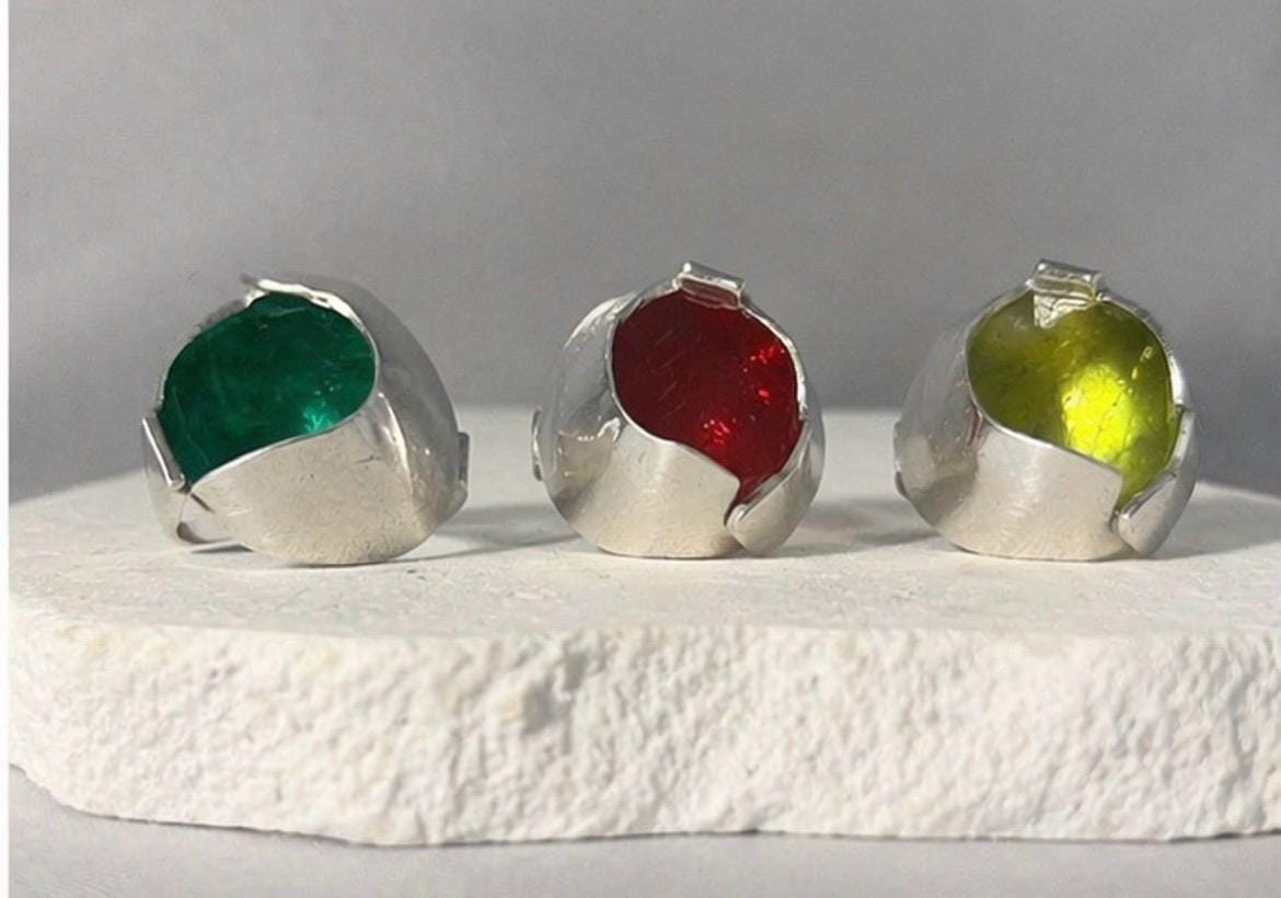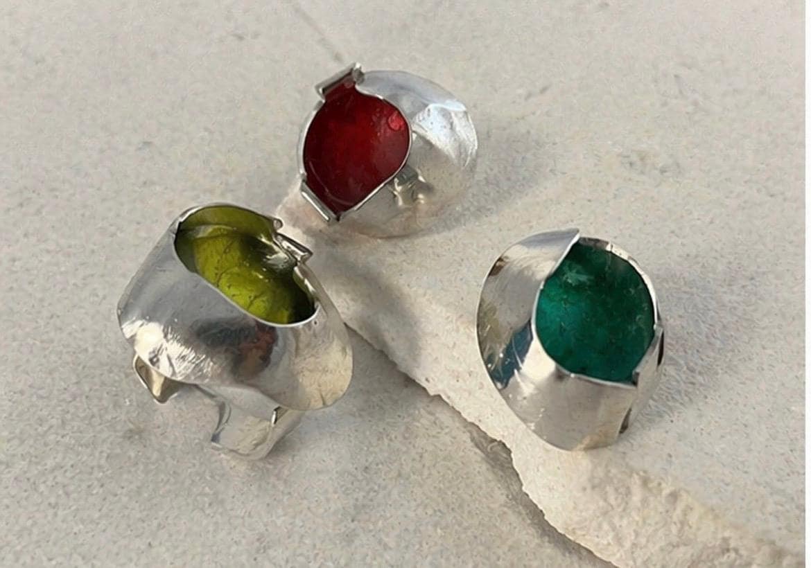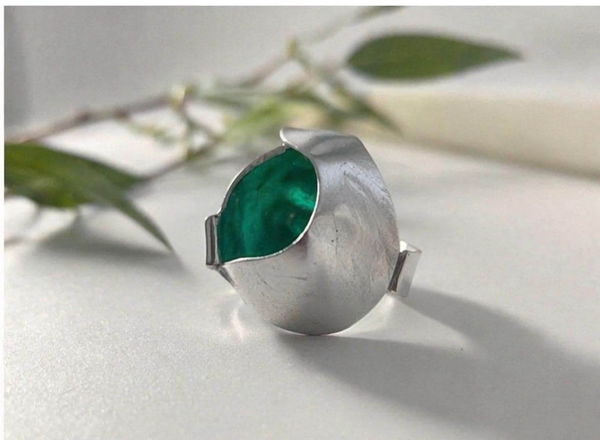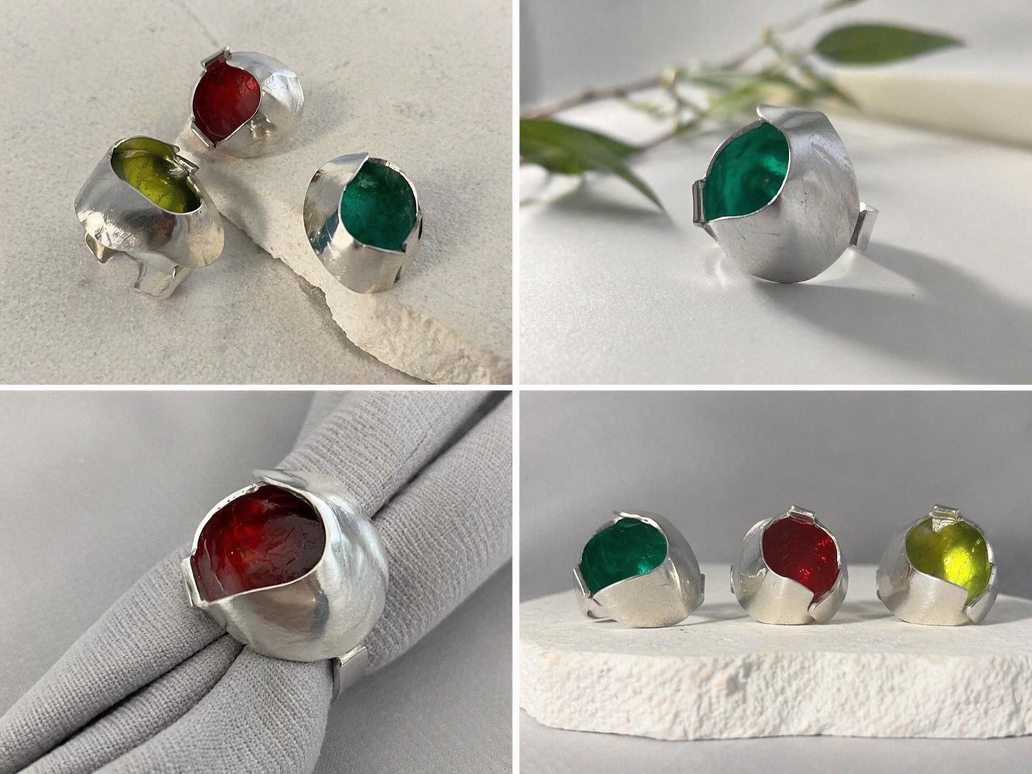 Cada anillo está trabajado a mano, creando una forma orgánica y contemporánea que envuelve el color en su interior, generando un contraste único entre el metal mate y el brillo del esmalte.